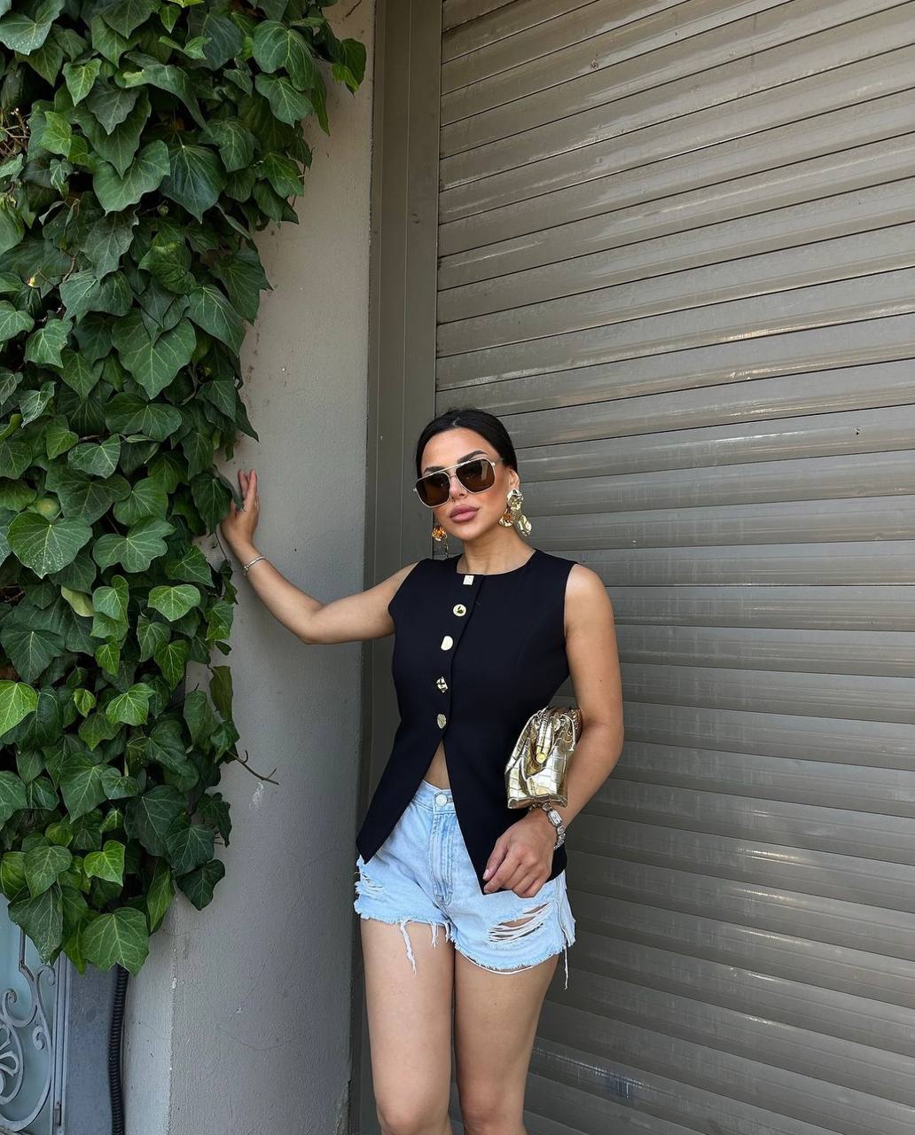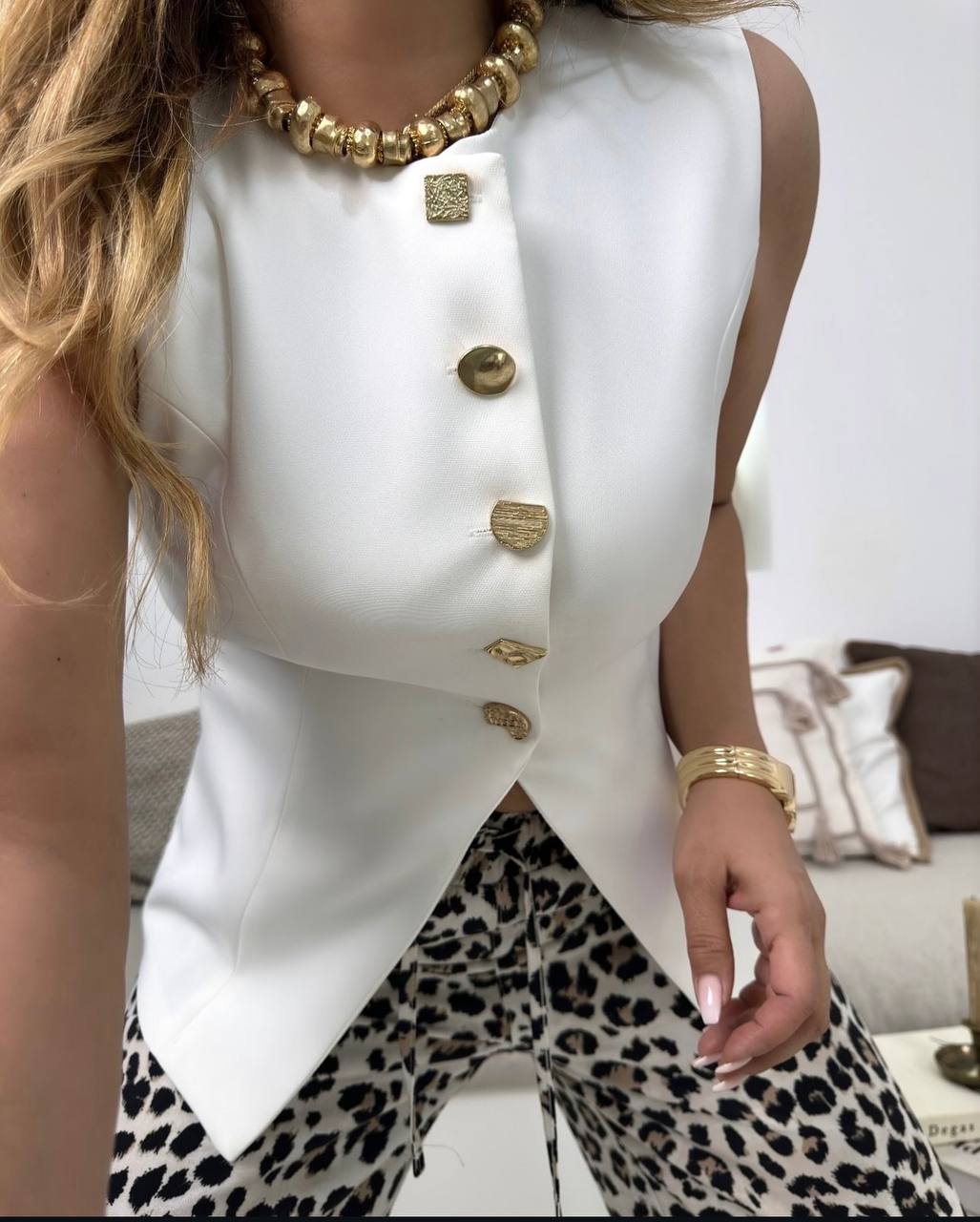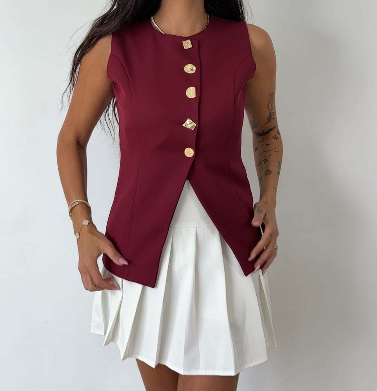 Turn heads with this structured sleeveless vest in rich burgundy, Black , White Featuring a unique asymmetric button-down design with statement gold buttons, it’s tailored to flatter with a sharp front slit and contoured fit. Style it with jeans for a chic daytime look or layer it over tailored trousers for elevated sophistication