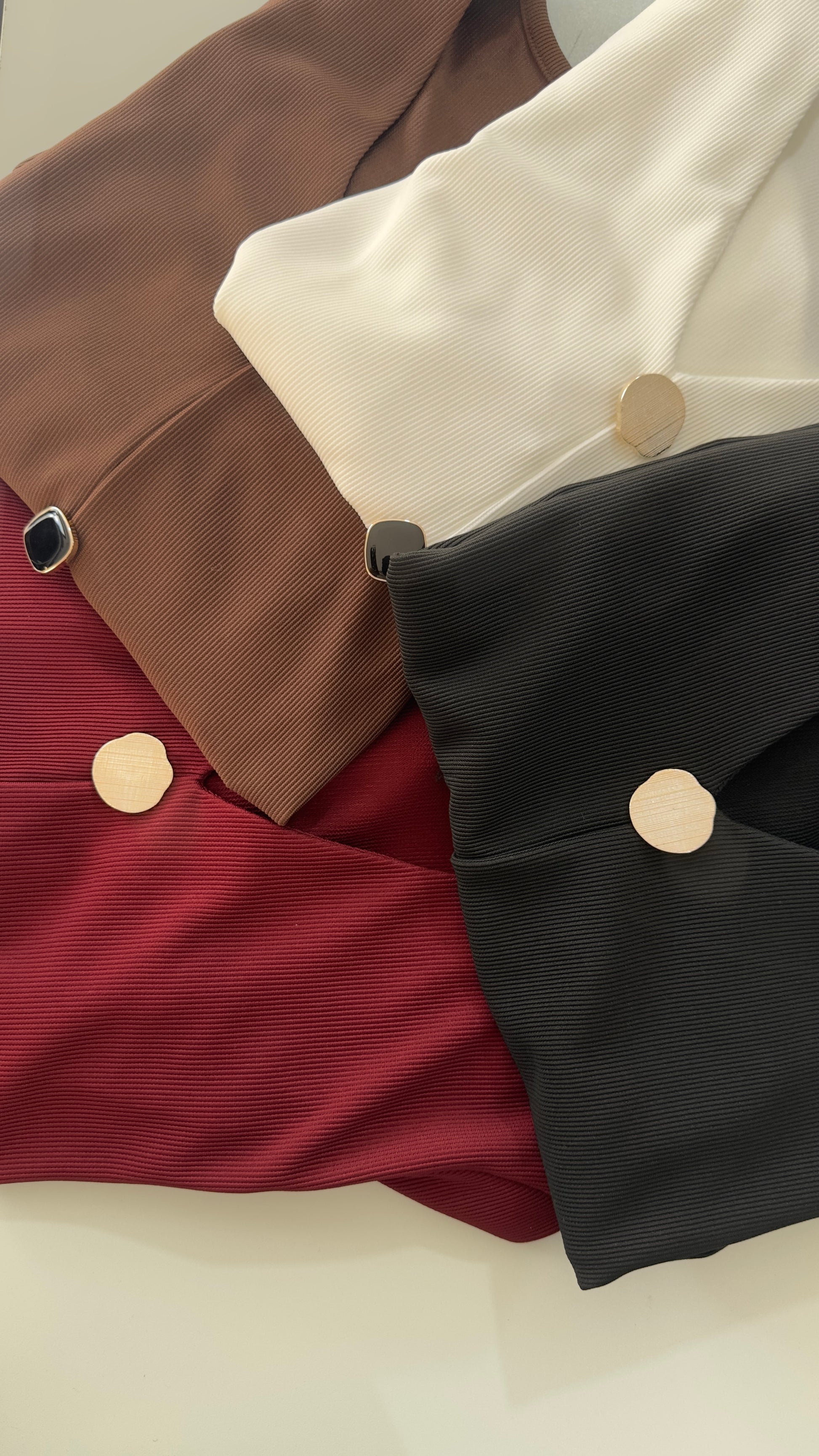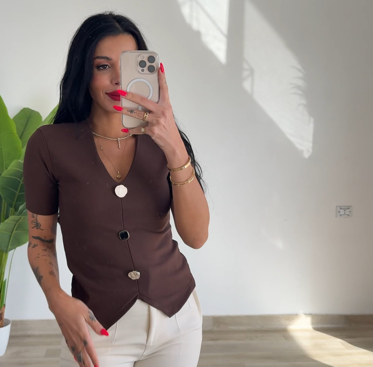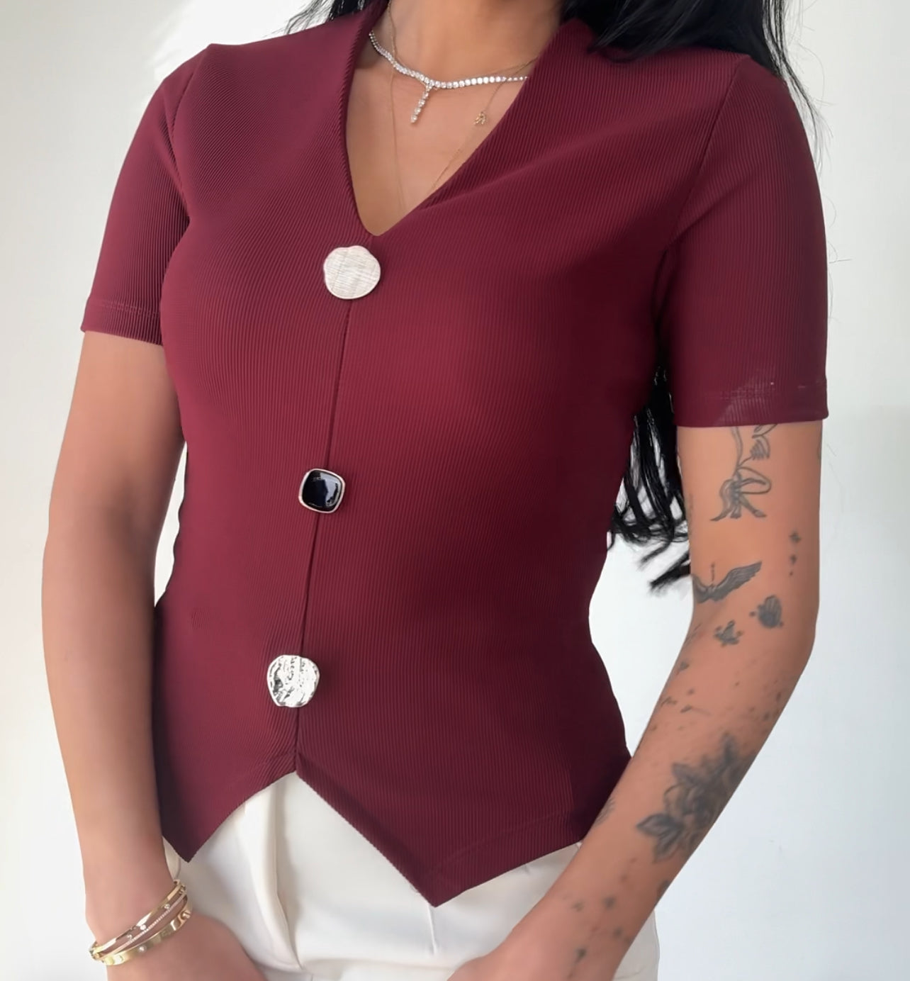 Upgrade your wardrobe with this elegant ribbed top, featuring unique statement buttons and a stylish V-neck cut. Designed for a flattering fit, its stretchable fabric ensures comfort while keeping you on trend. Perfect for casual or semi-formal looks, pair it with jeans, skirts, or tailored pants for an effortlessly chic ensemble.