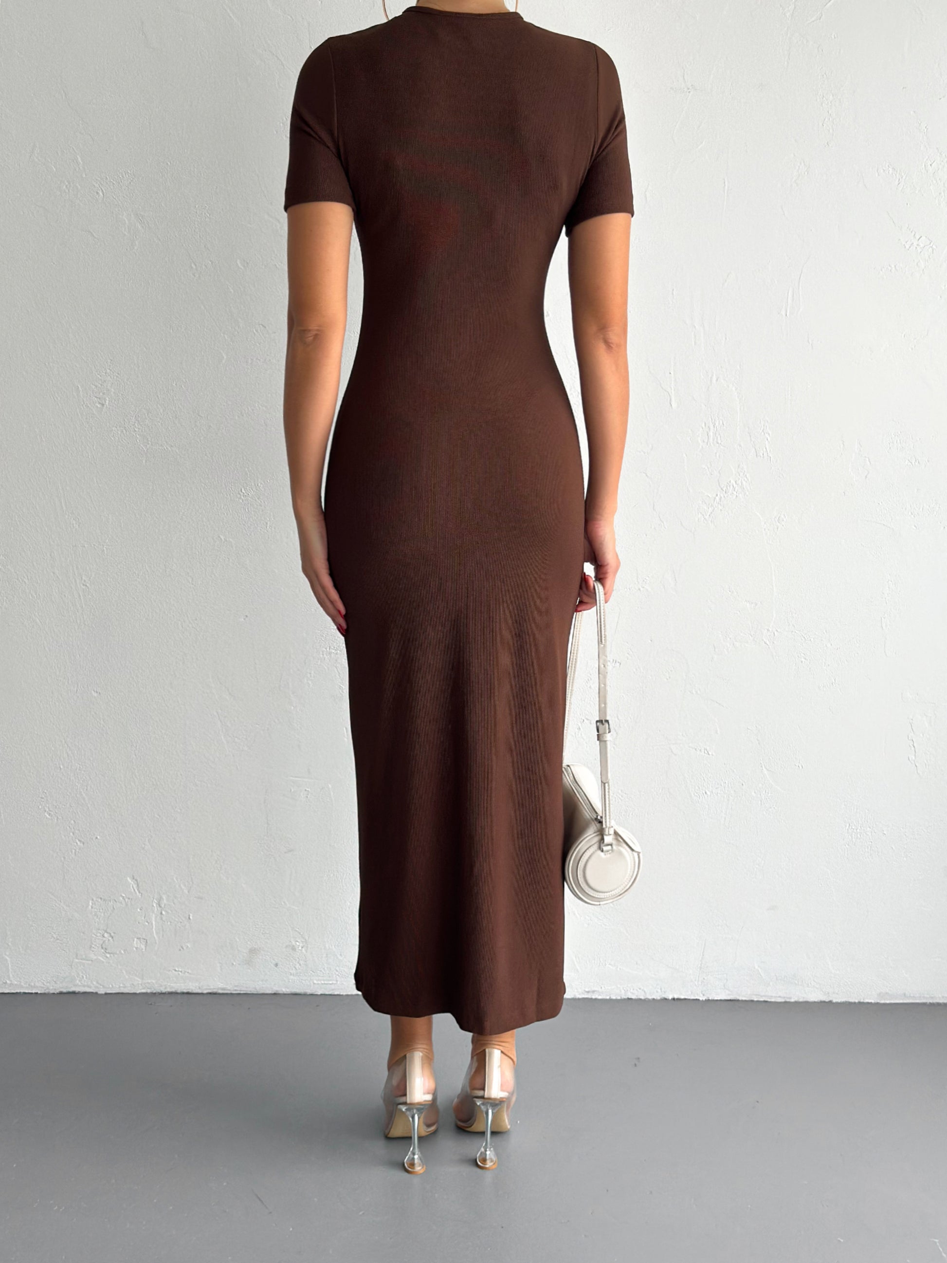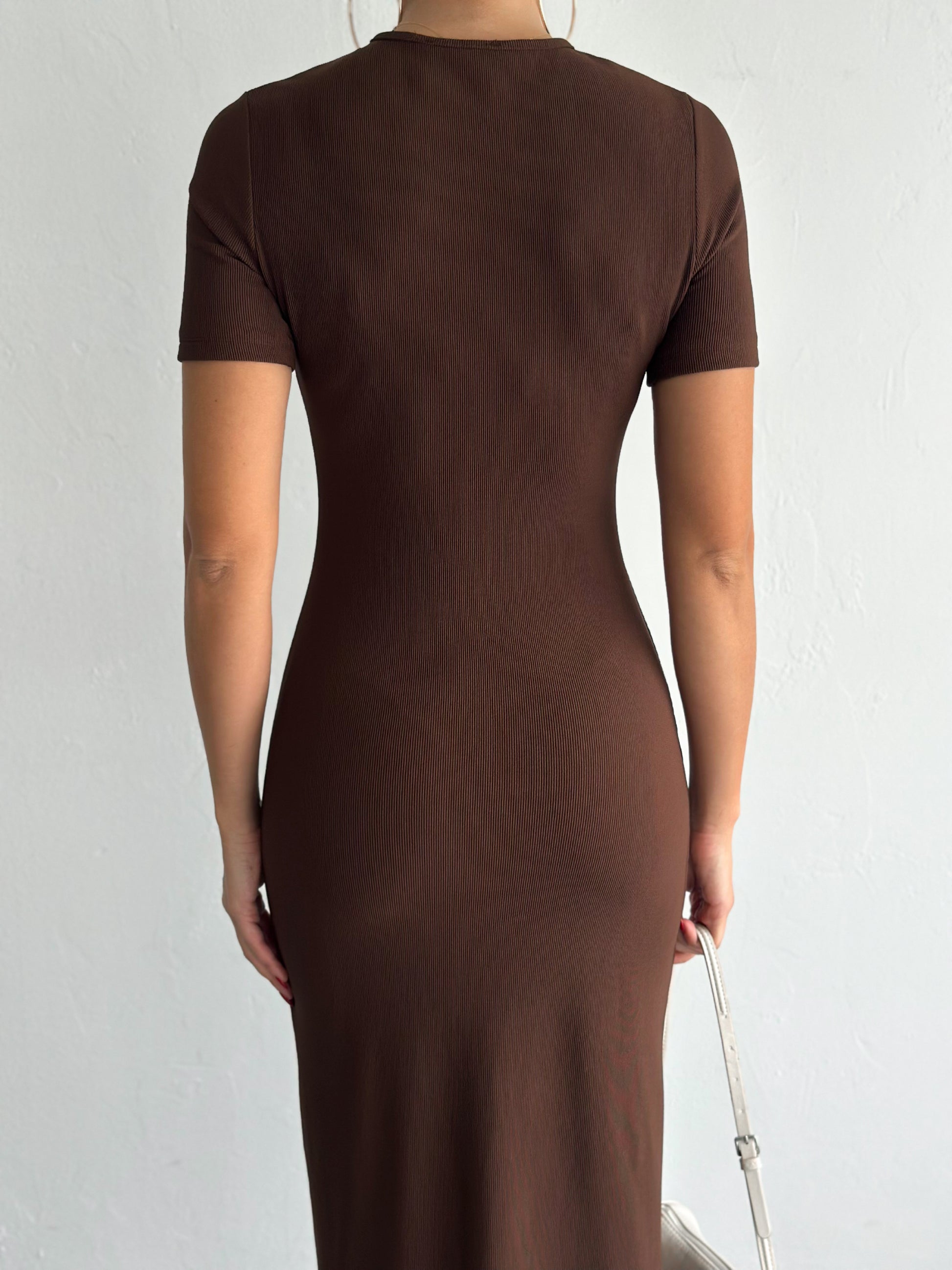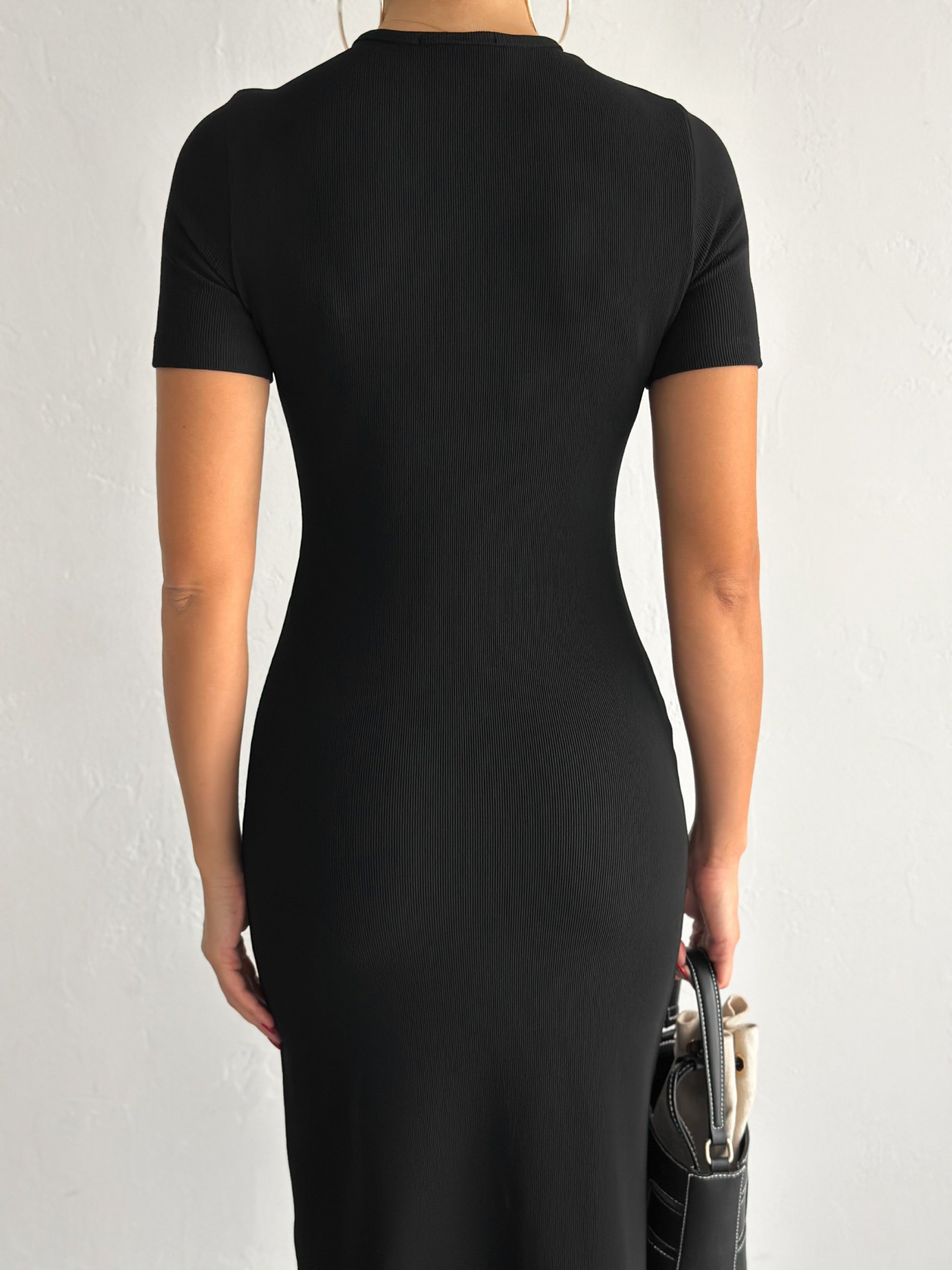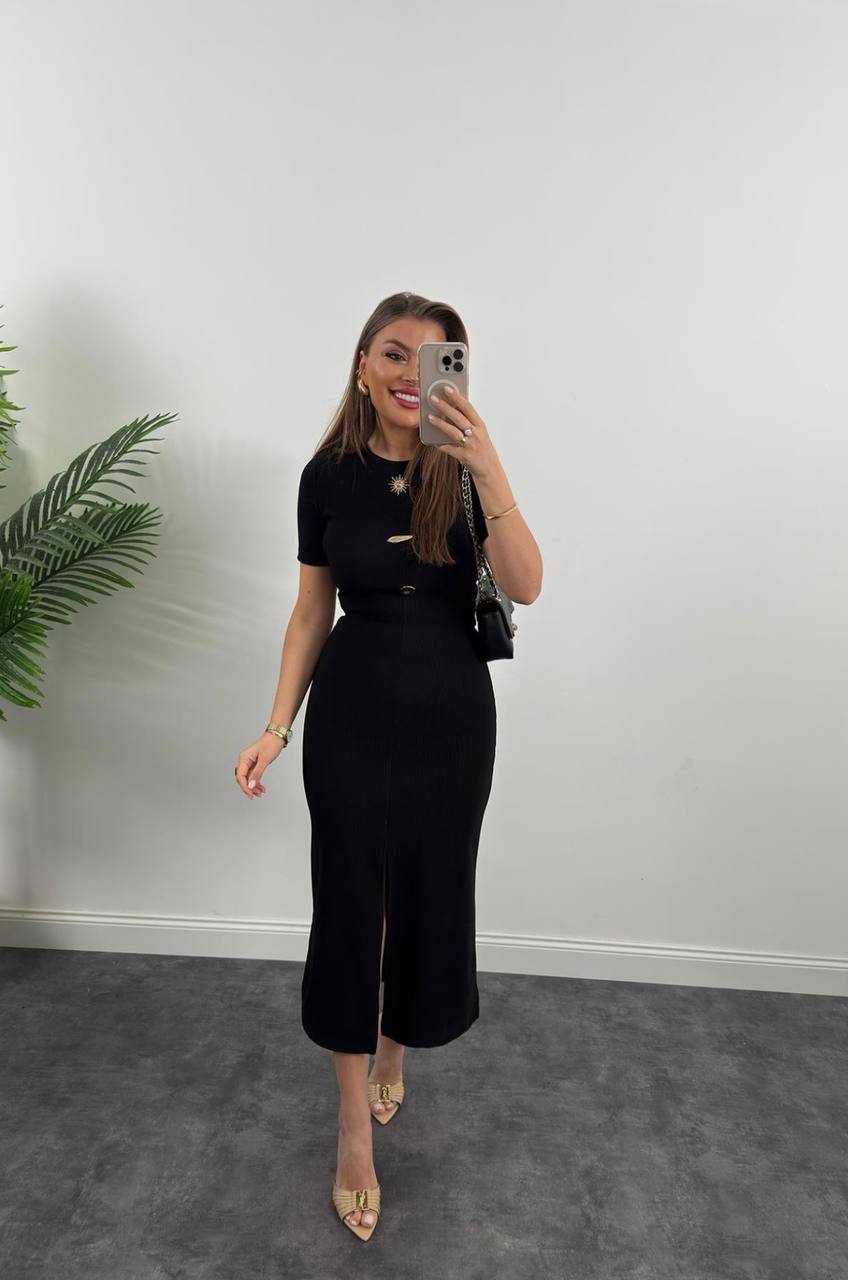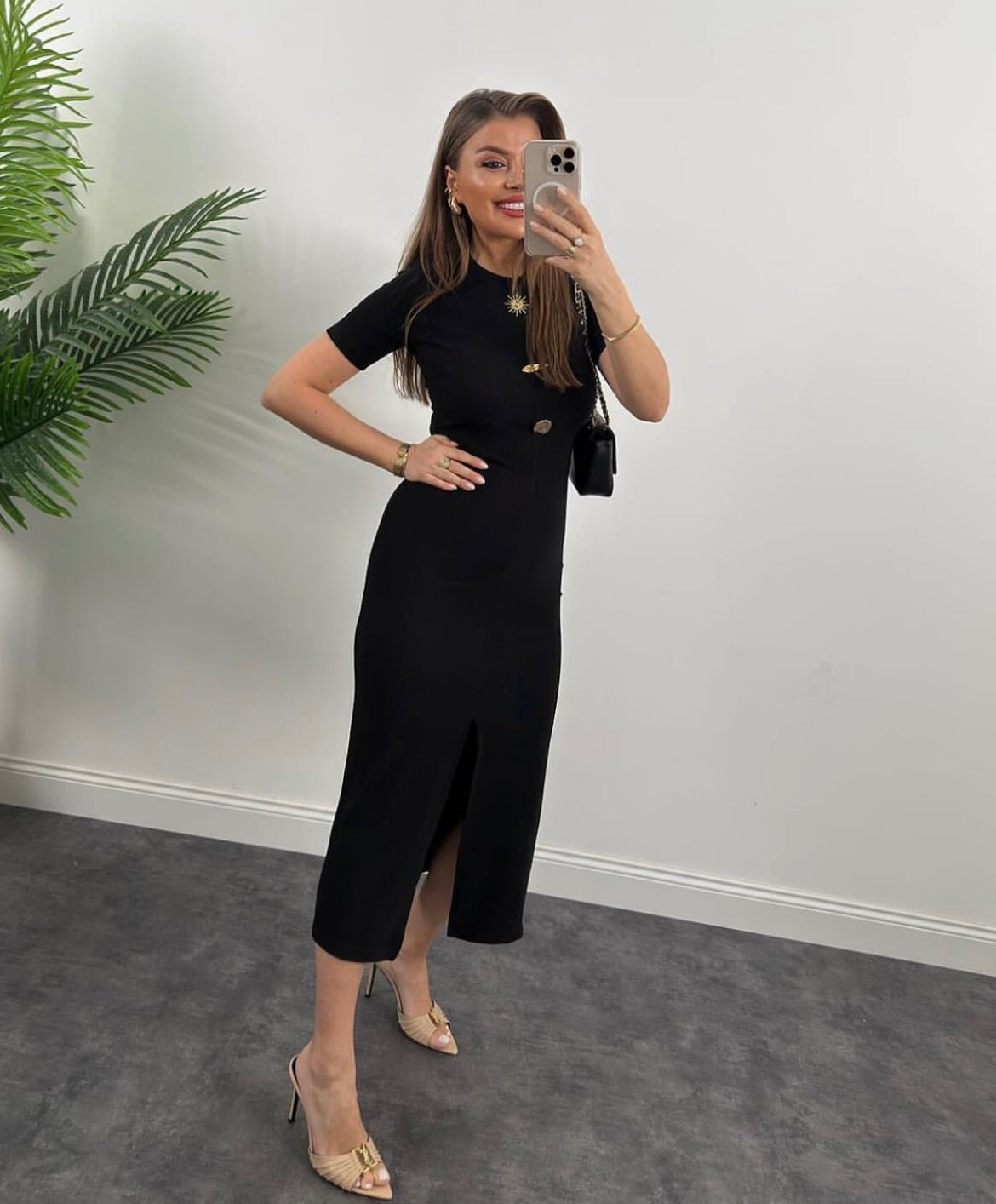 Turn heads with this sophisticated ribbed midi dress, designed with a figure-hugging fit and subtle gold-tone button details for a chic touch. Half sleeves cut and front slit add a modern edge, making it perfect for both day and evening wear. Available in classic black and deep burgundy, this dress is a must-have for effortless elegance.