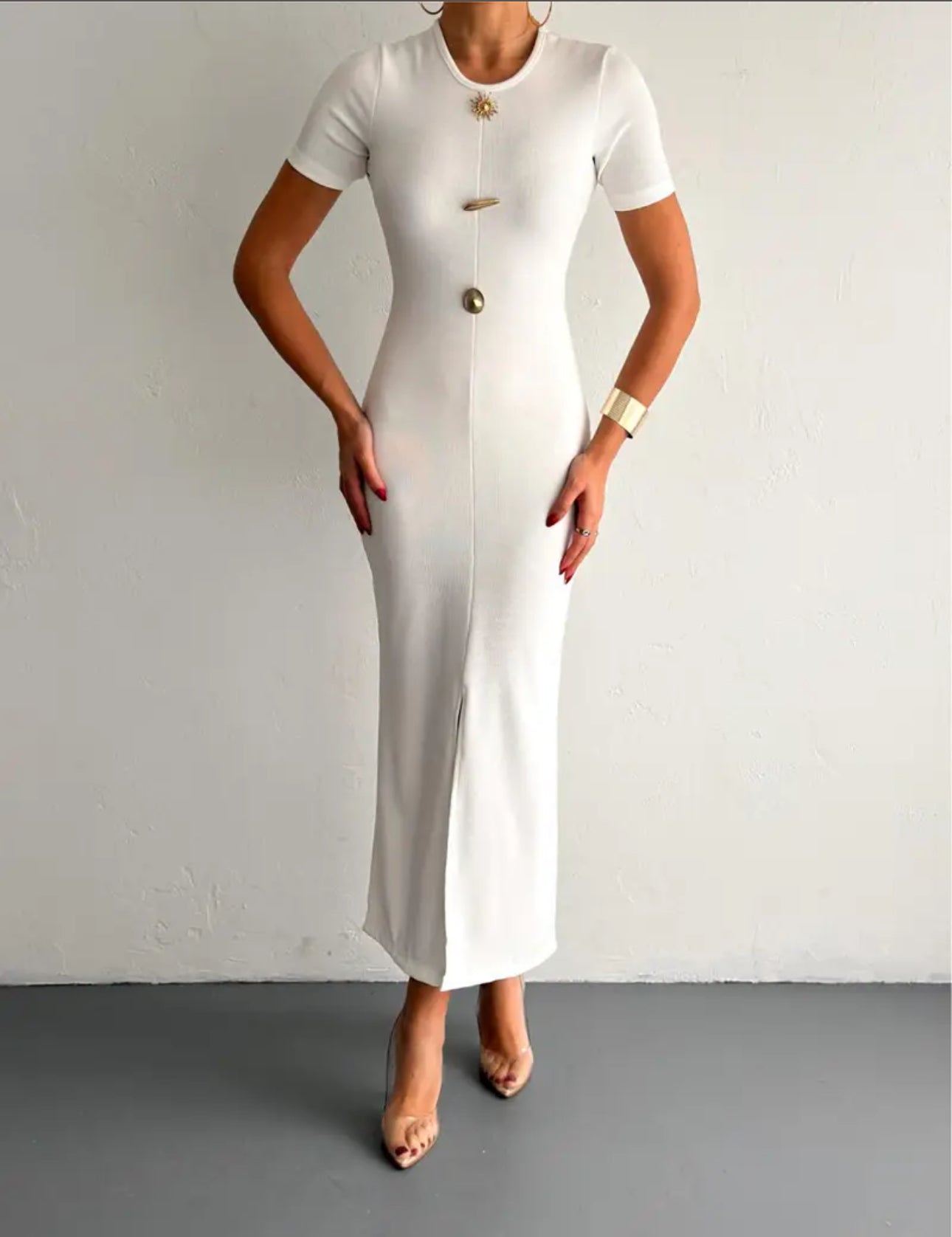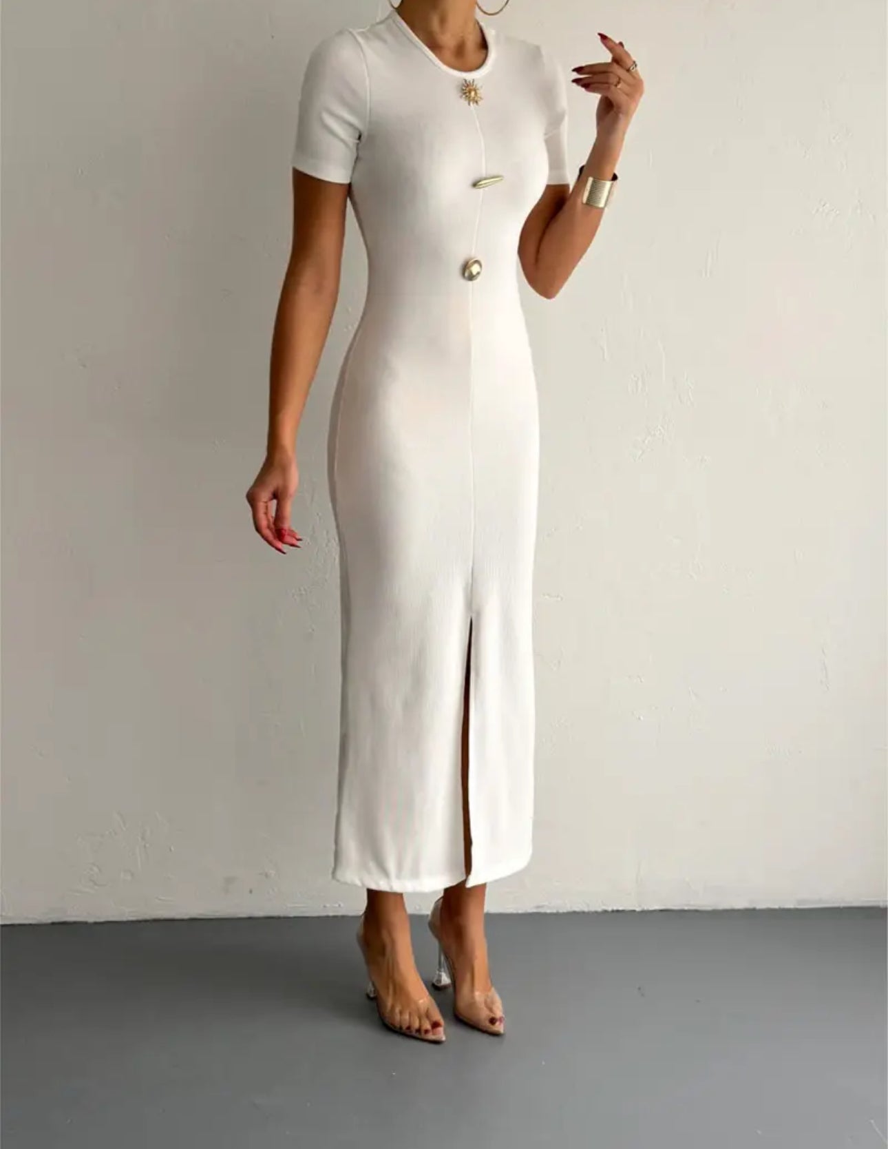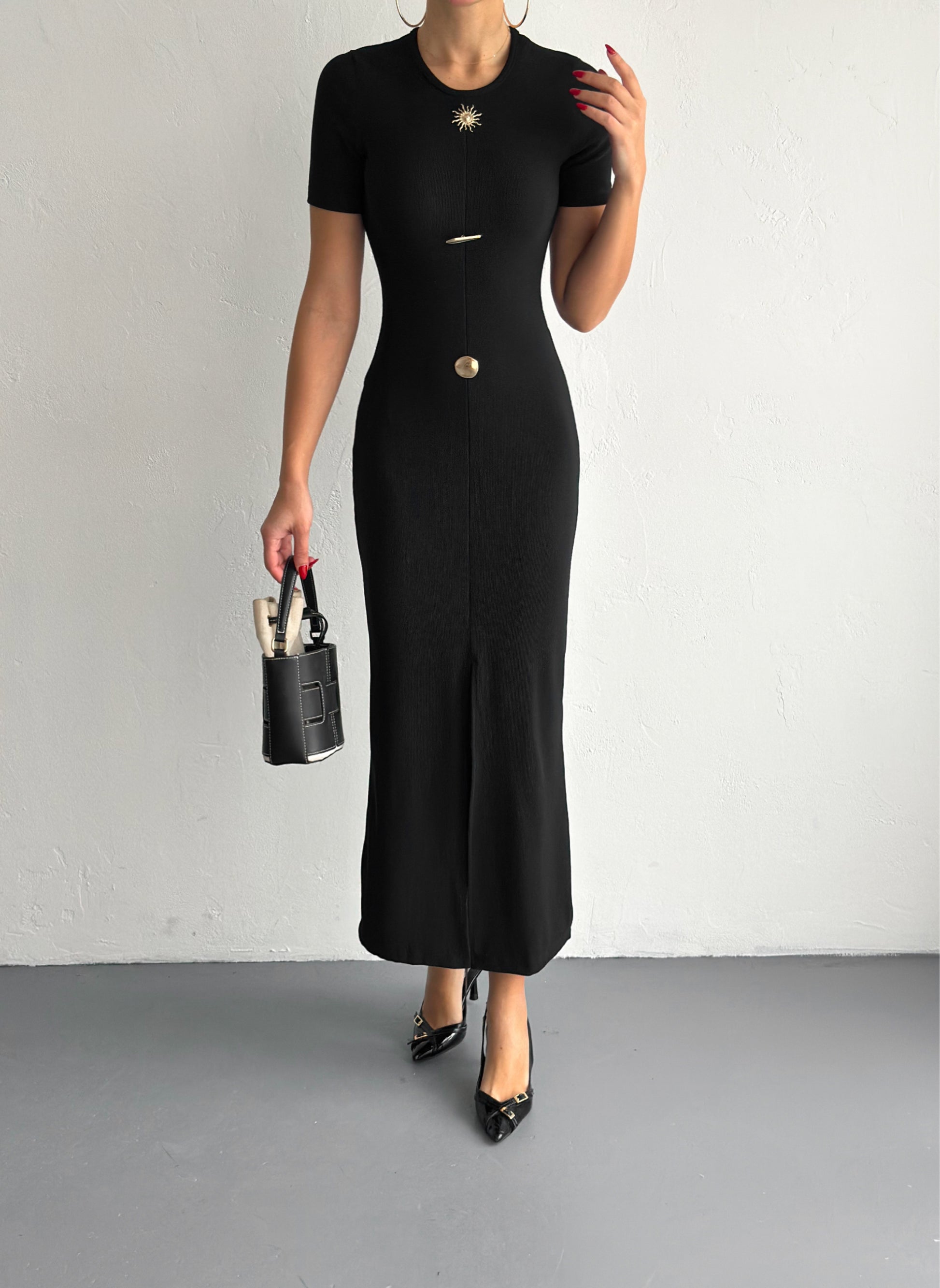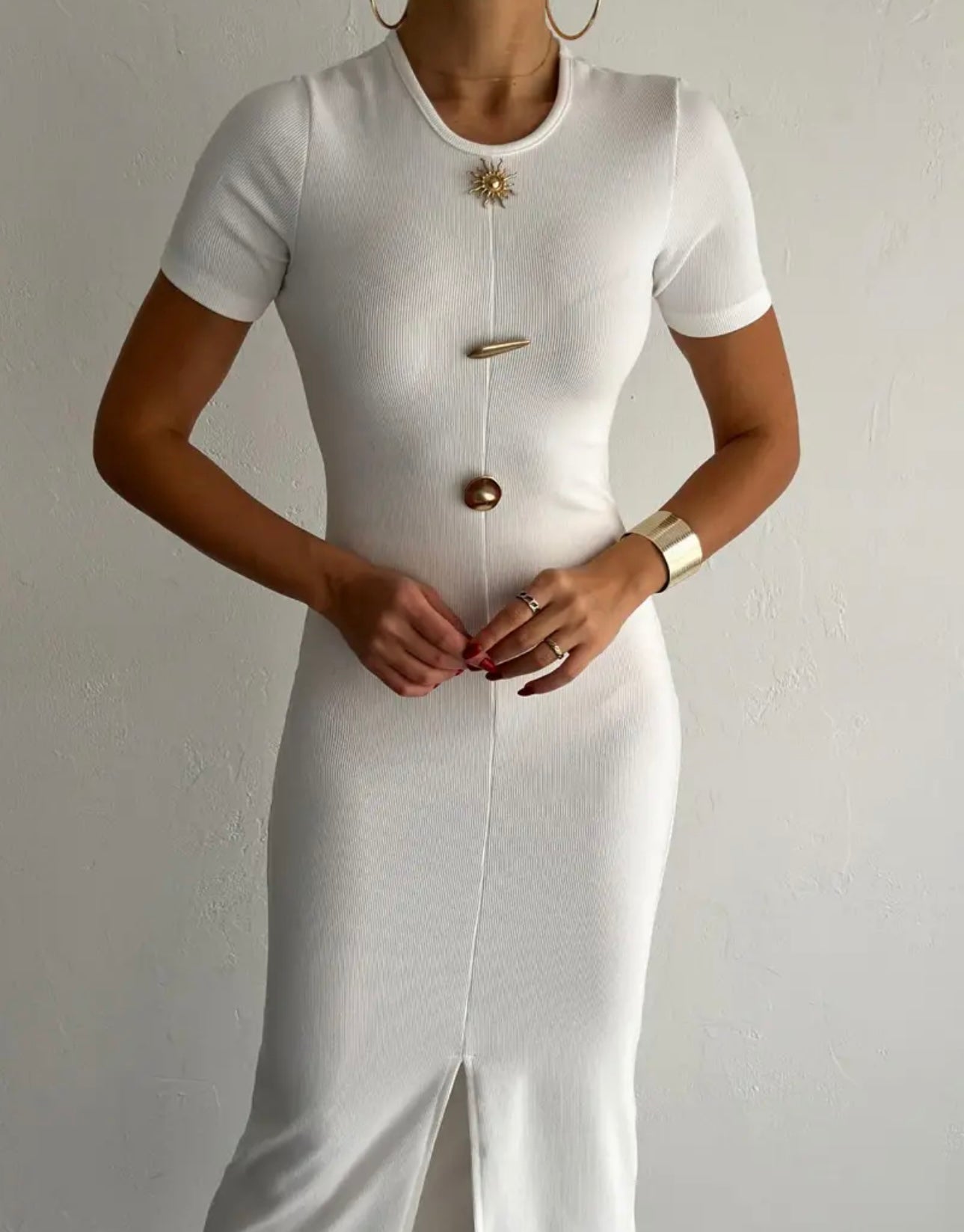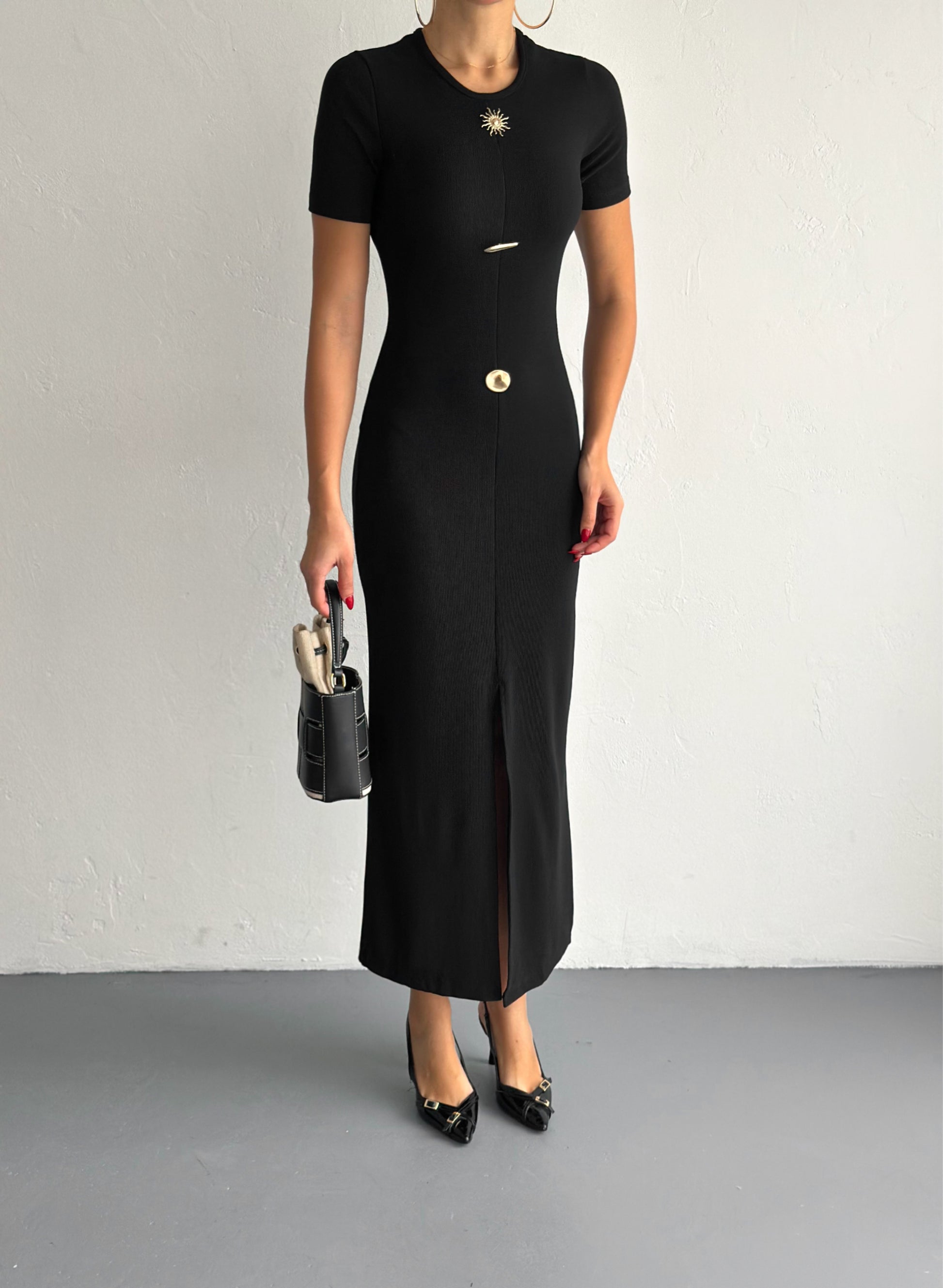 Elegant Ribbed Midi Dress with Gold Accents - Half Sleeves