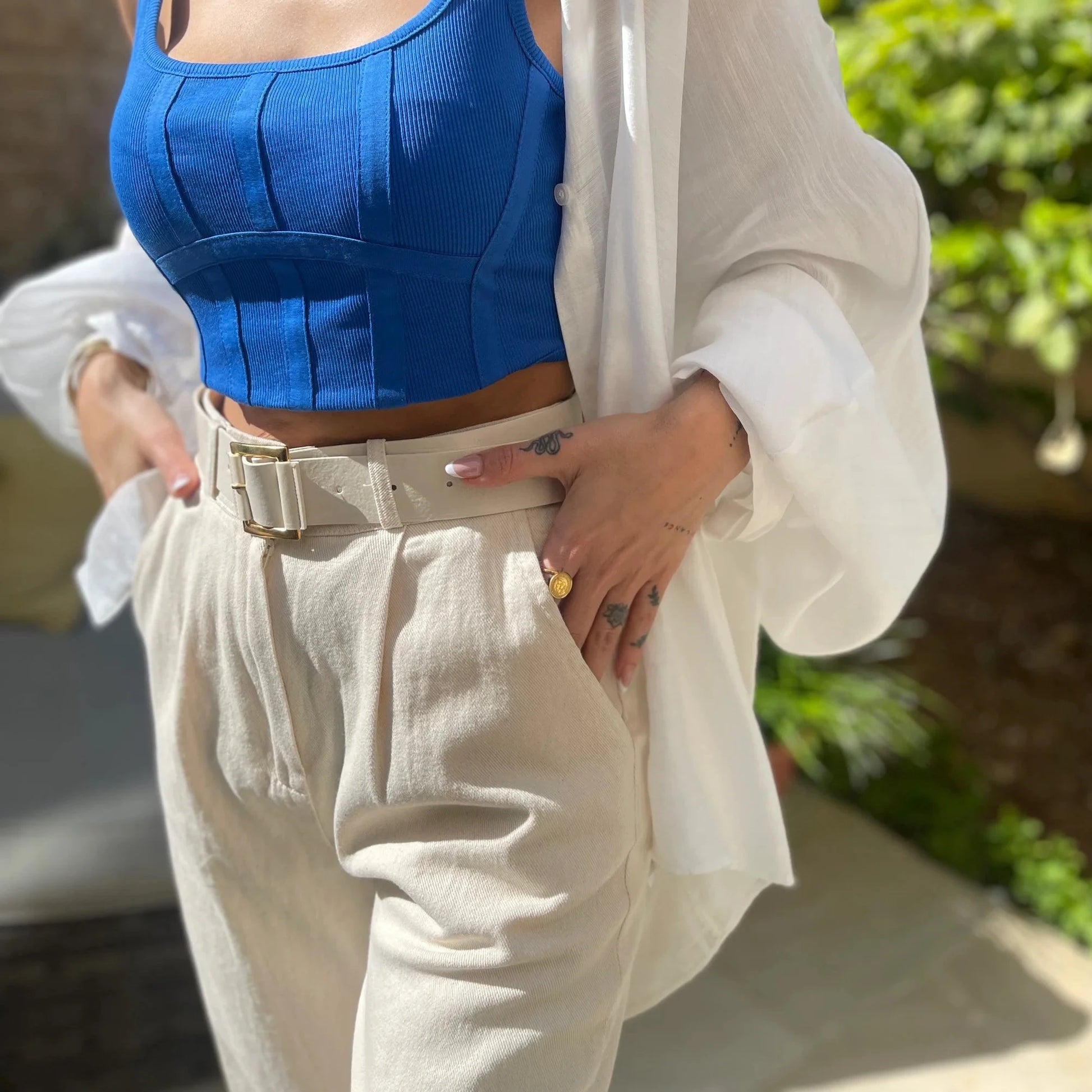 High-waisted linen pants with belt and side pockets. Straight fit, available in beige.