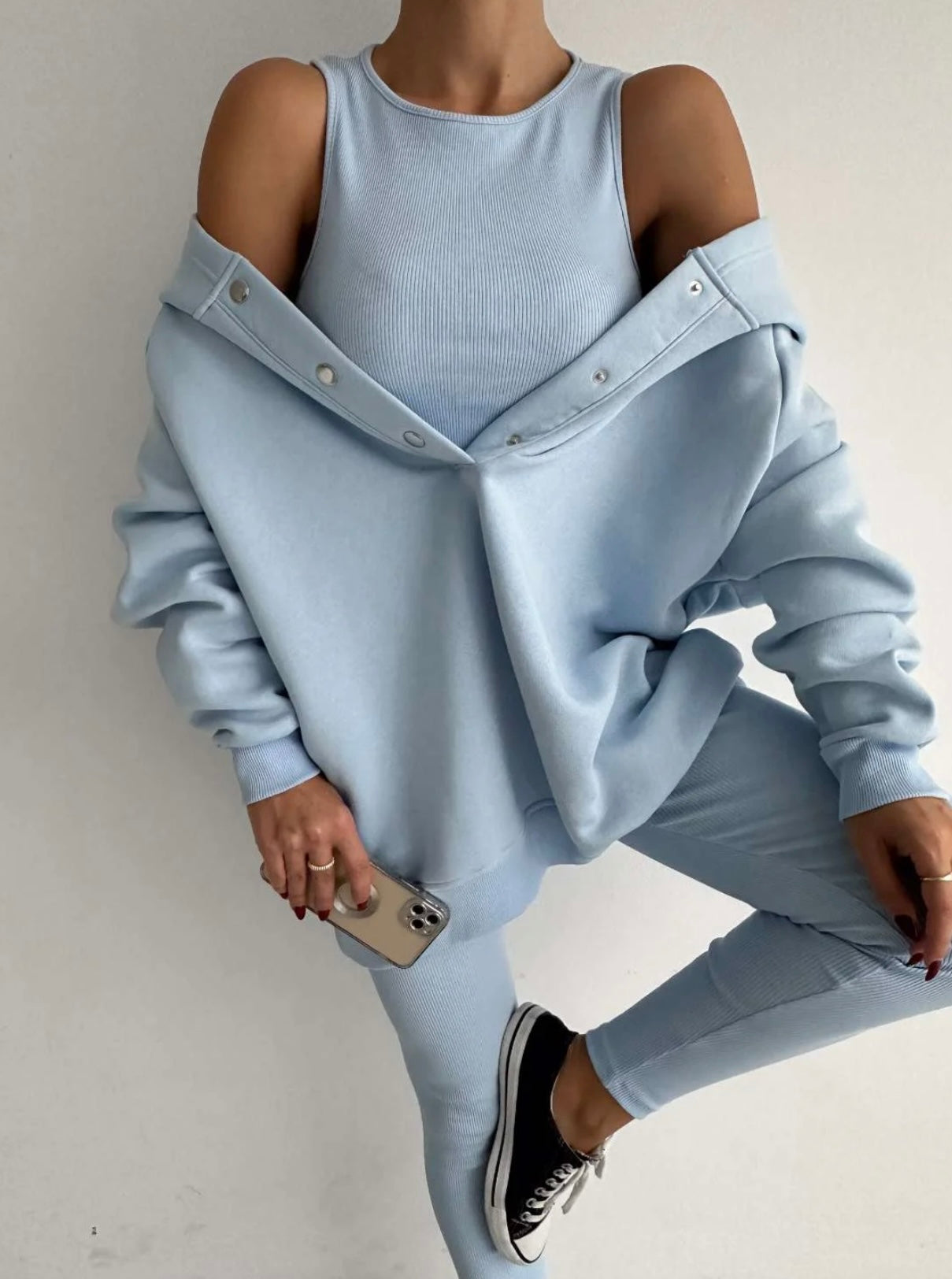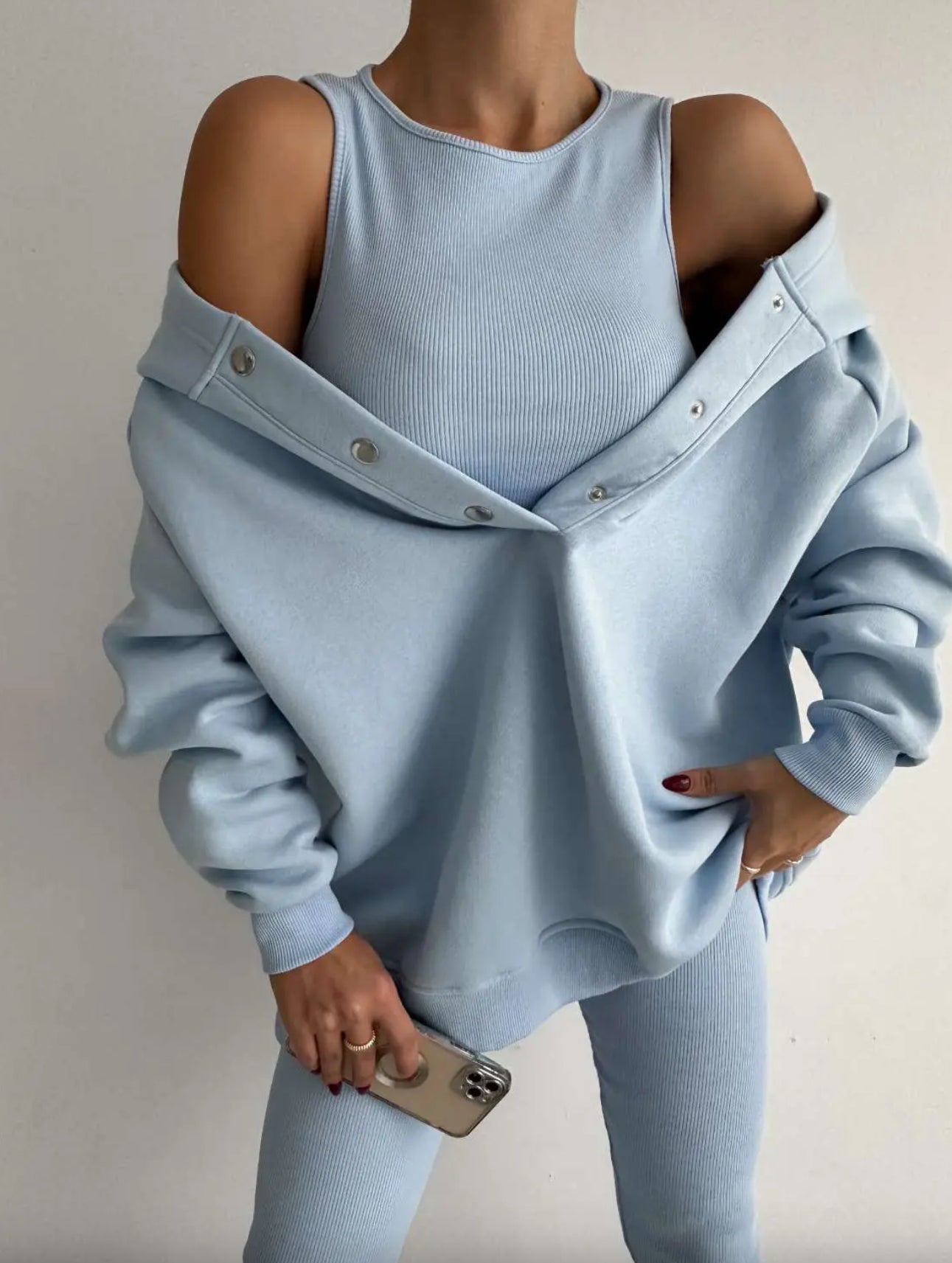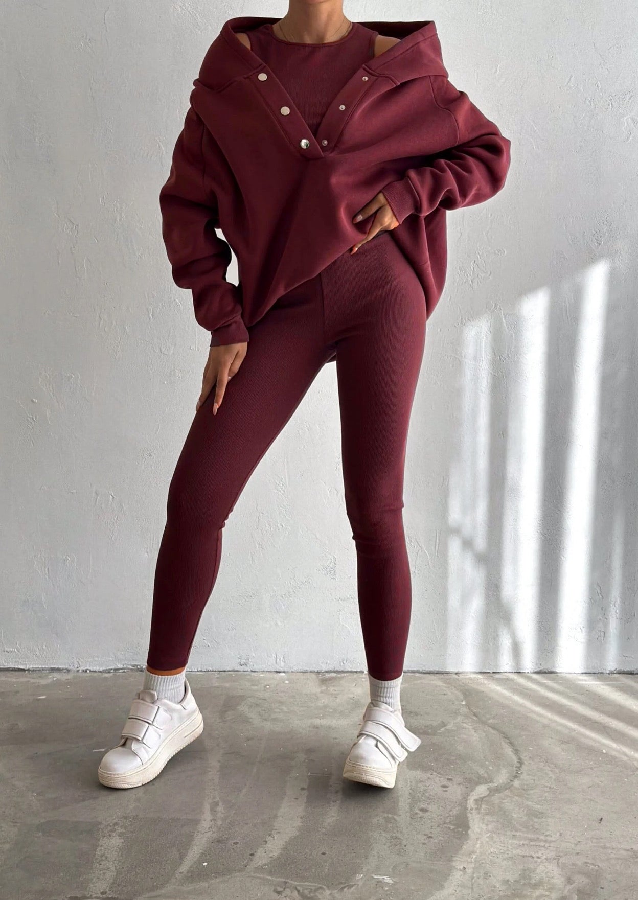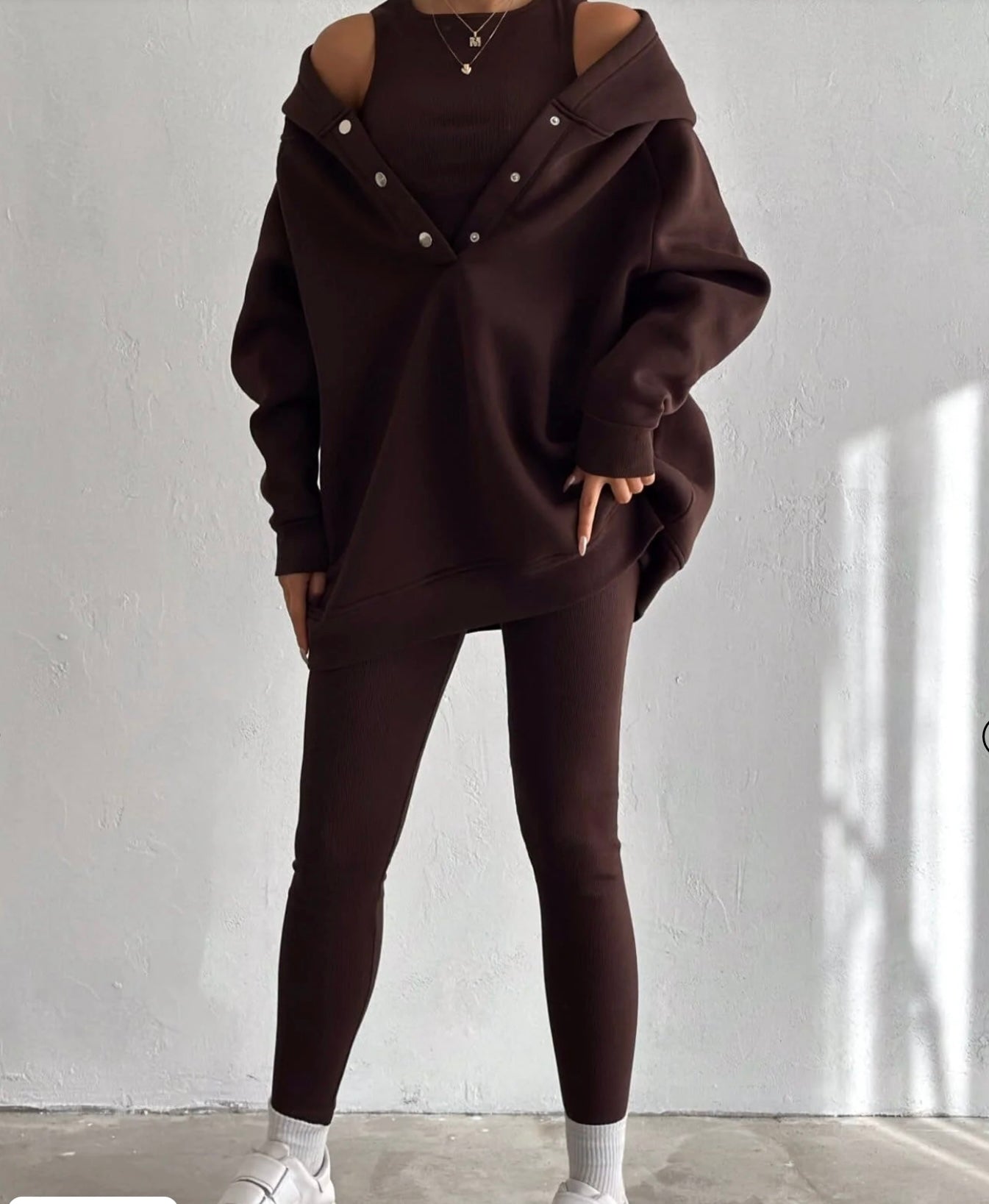 Elevate your loungewear game with our Hoodie, Top, and Leggings Set. Designed for ultimate comfort and style, this coordinated ensemble features a cozy hoodie, a versatile top, and sleek leggings. Crafted from high-quality fabric, each piece offers a perfect blend of softness and durability. Whether you're running errands or relaxing at home, this set has you covered in both comfort and fashion.