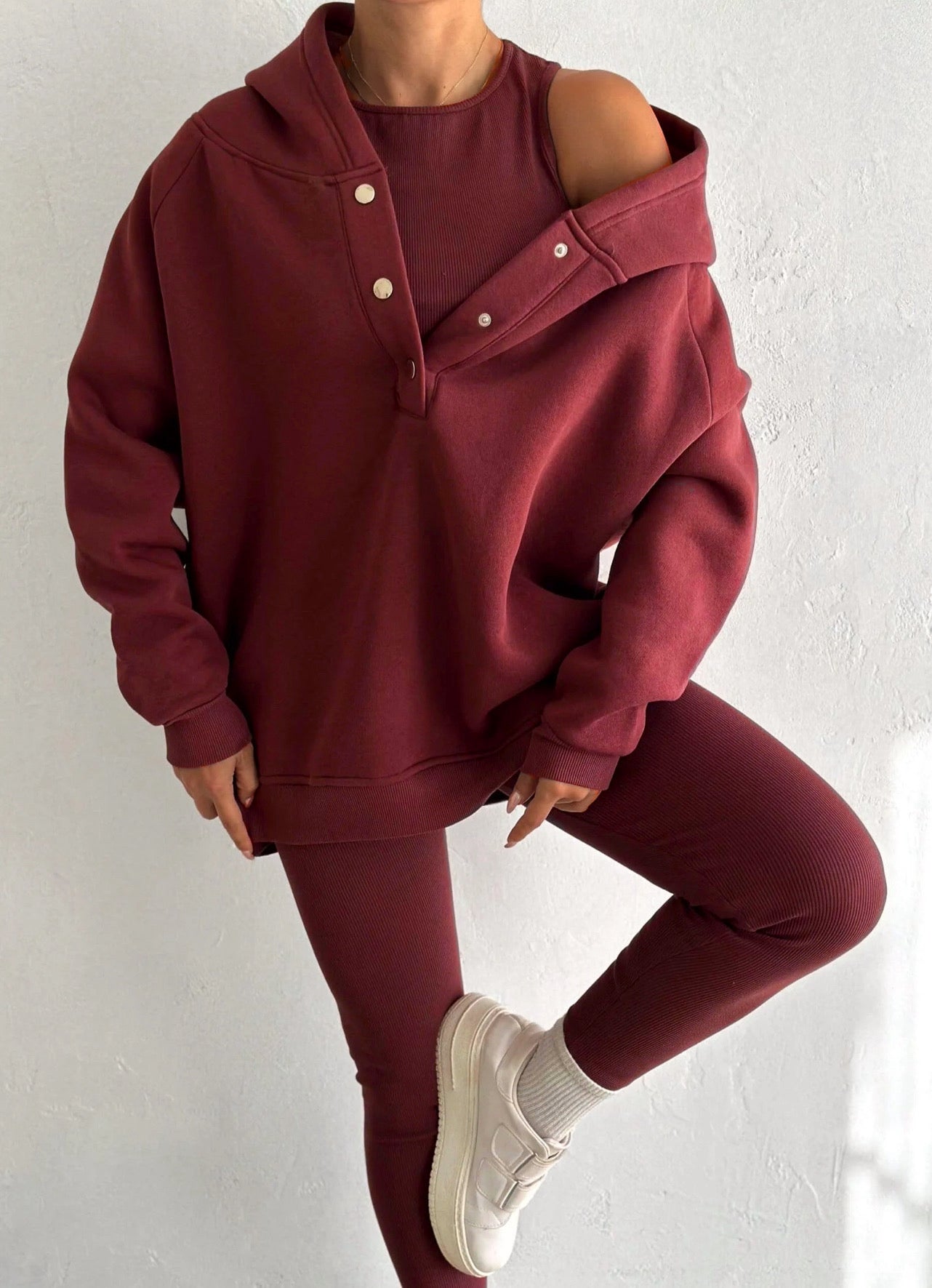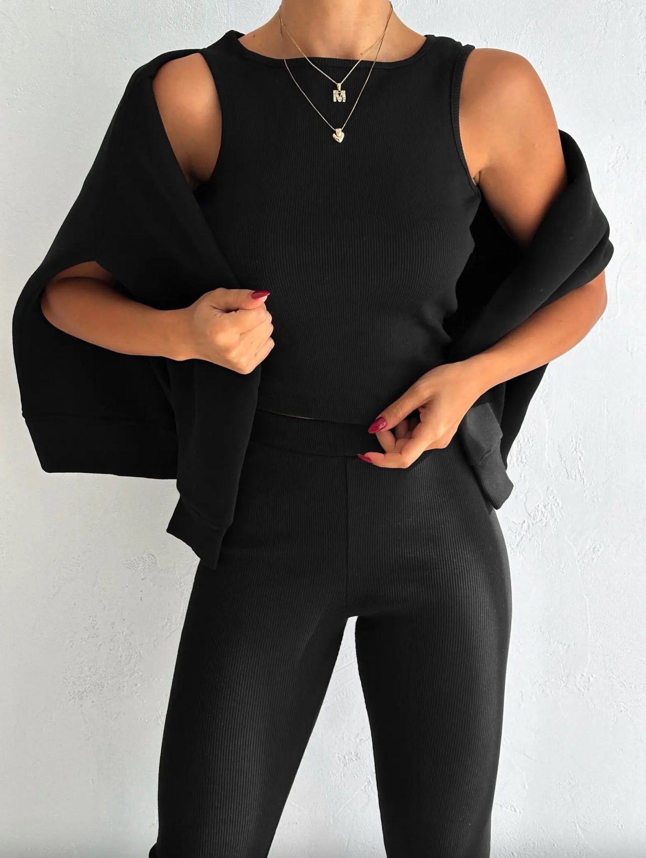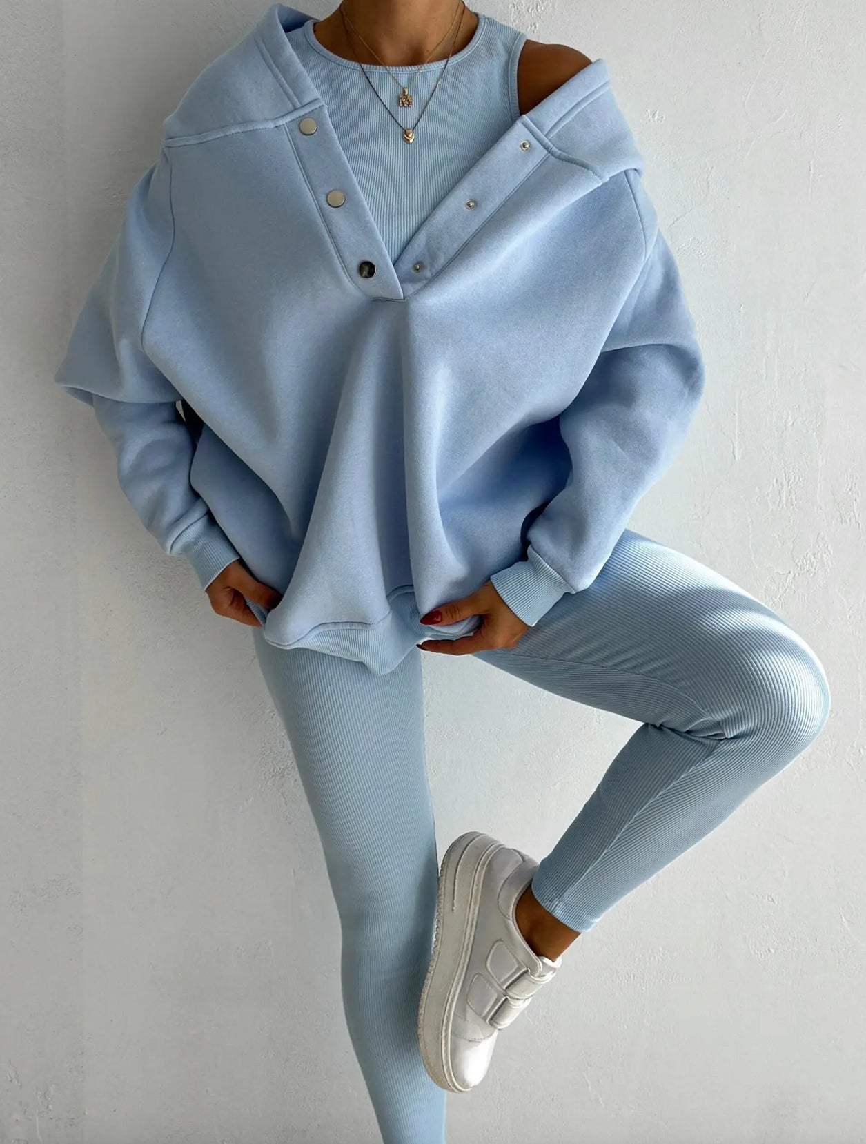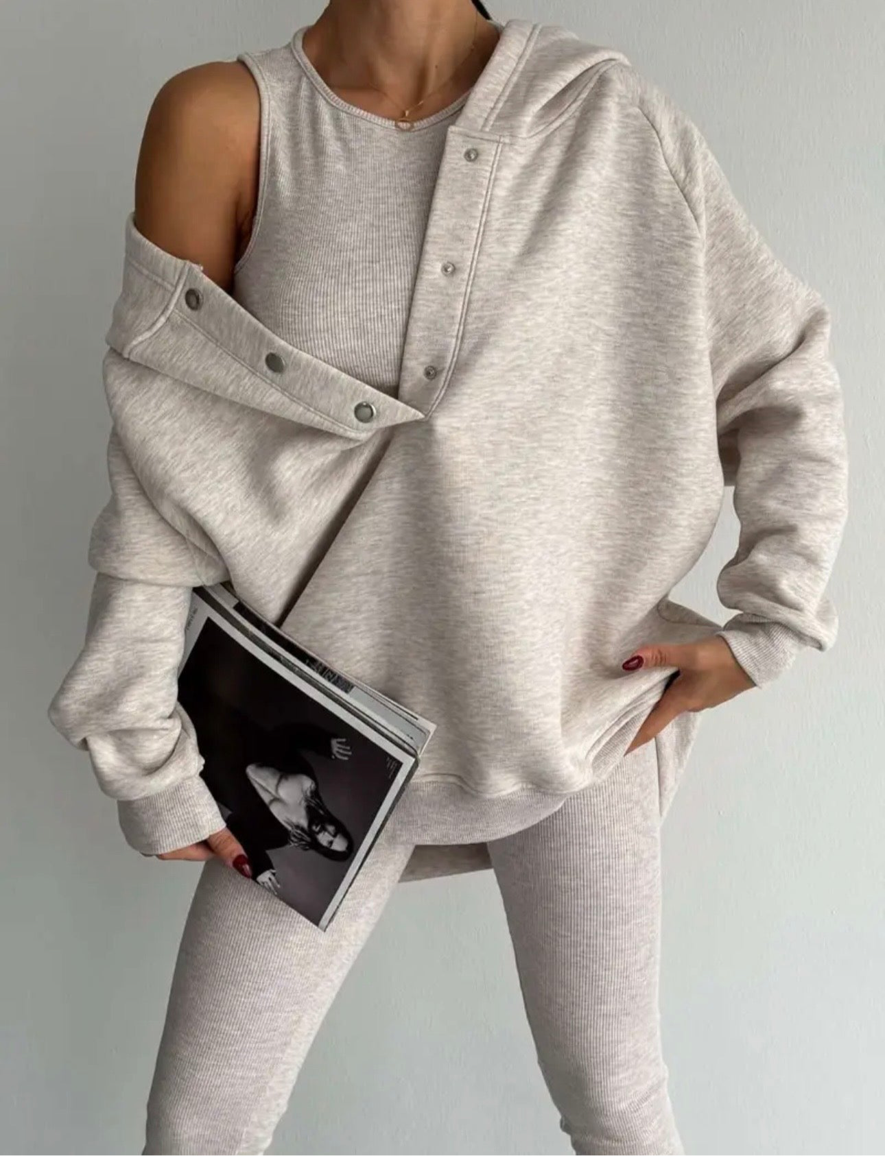 Elevate your loungewear game with our Hoodie, Top, and Leggings Set. Designed for ultimate comfort and style, this coordinated ensemble features a cozy hoodie, a versatile top, and sleek leggings. Crafted from high-quality fabric, each piece offers a perfect blend of softness and durability. Whether you're running errands or relaxing at home, this set has you covered in both comfort and fashion.