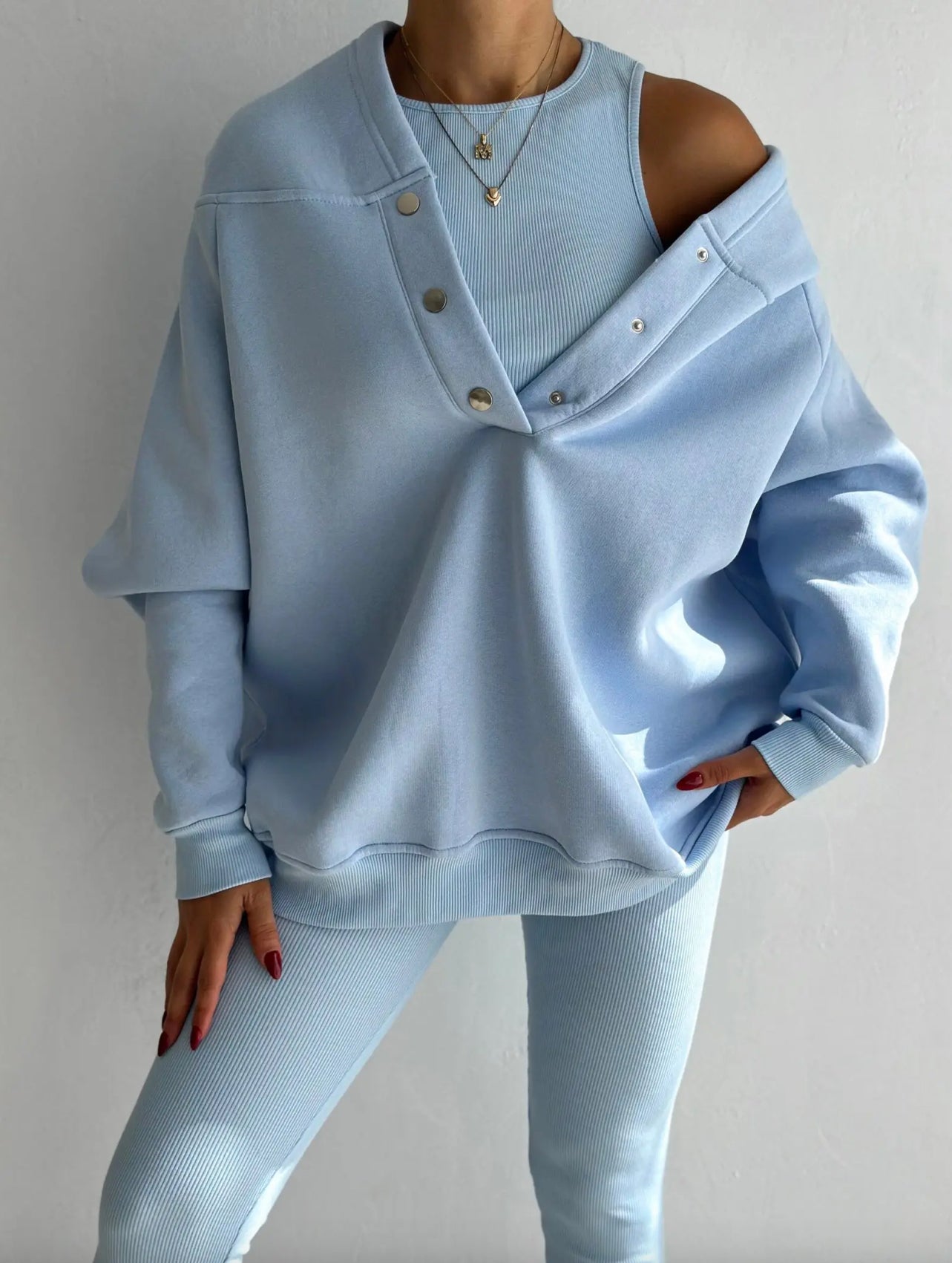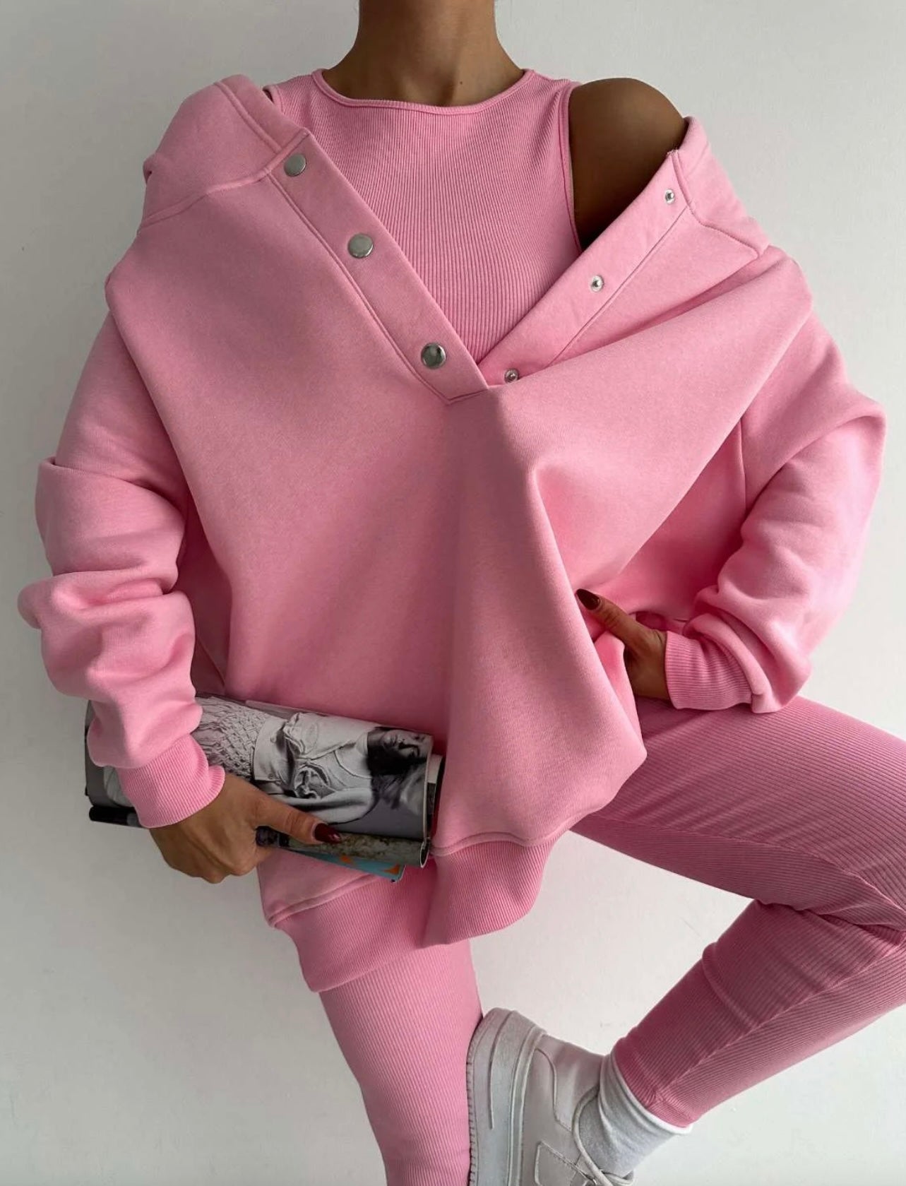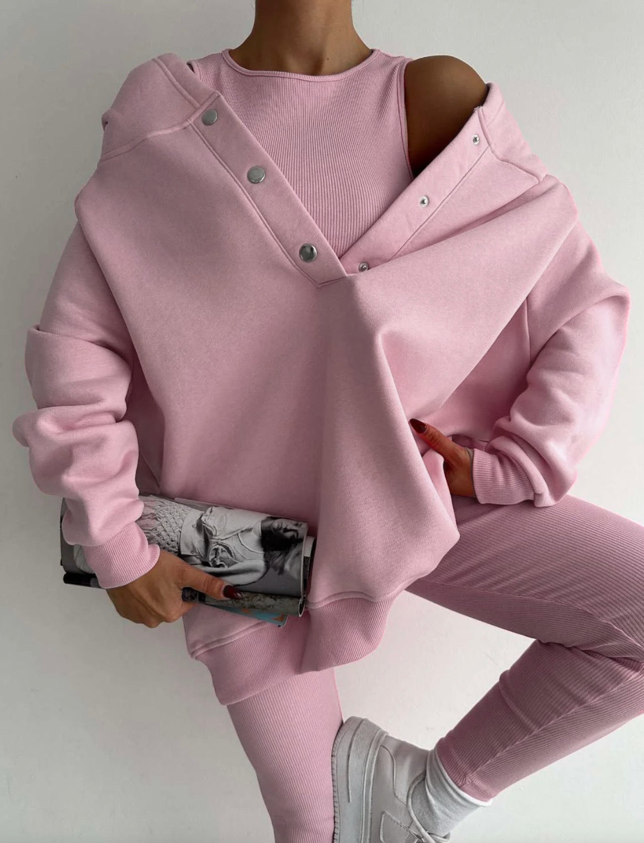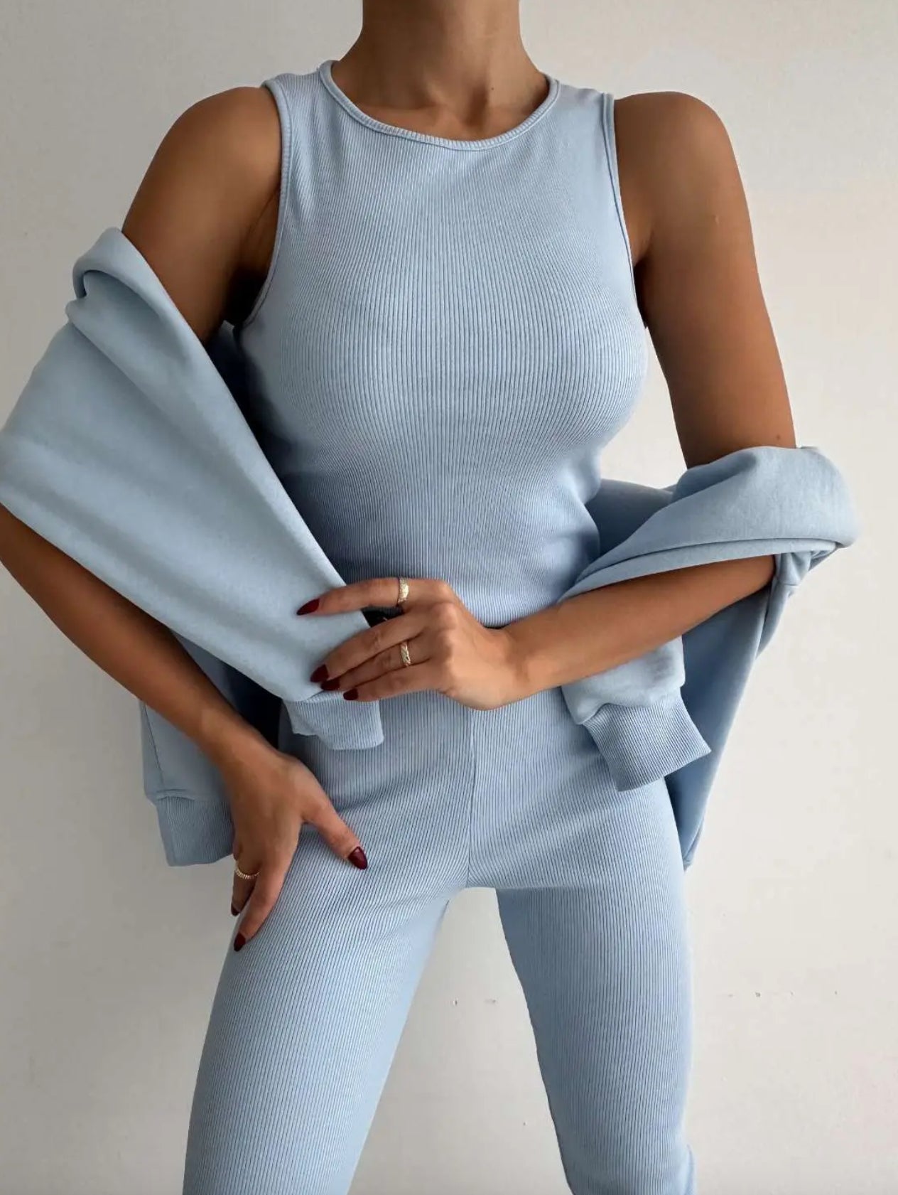 Elevate your loungewear game with our Hoodie, Top, and Leggings Set. Designed for ultimate comfort and style, this coordinated ensemble features a cozy hoodie, a versatile top, and sleek leggings. Crafted from high-quality fabric, each piece offers a perfect blend of softness and durability. Whether you're running errands or relaxing at home, this set has you covered in both comfort and fashion.