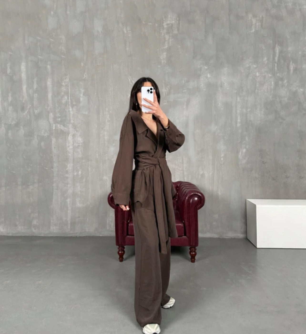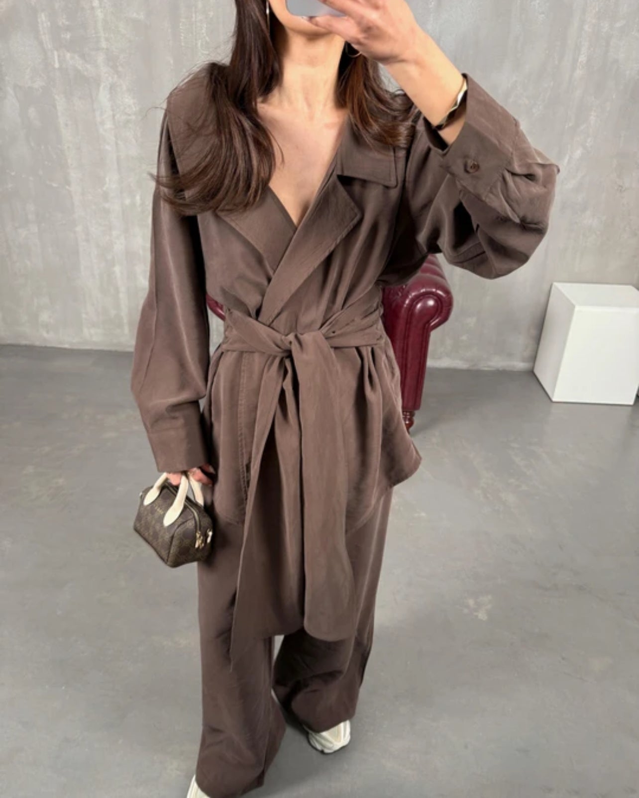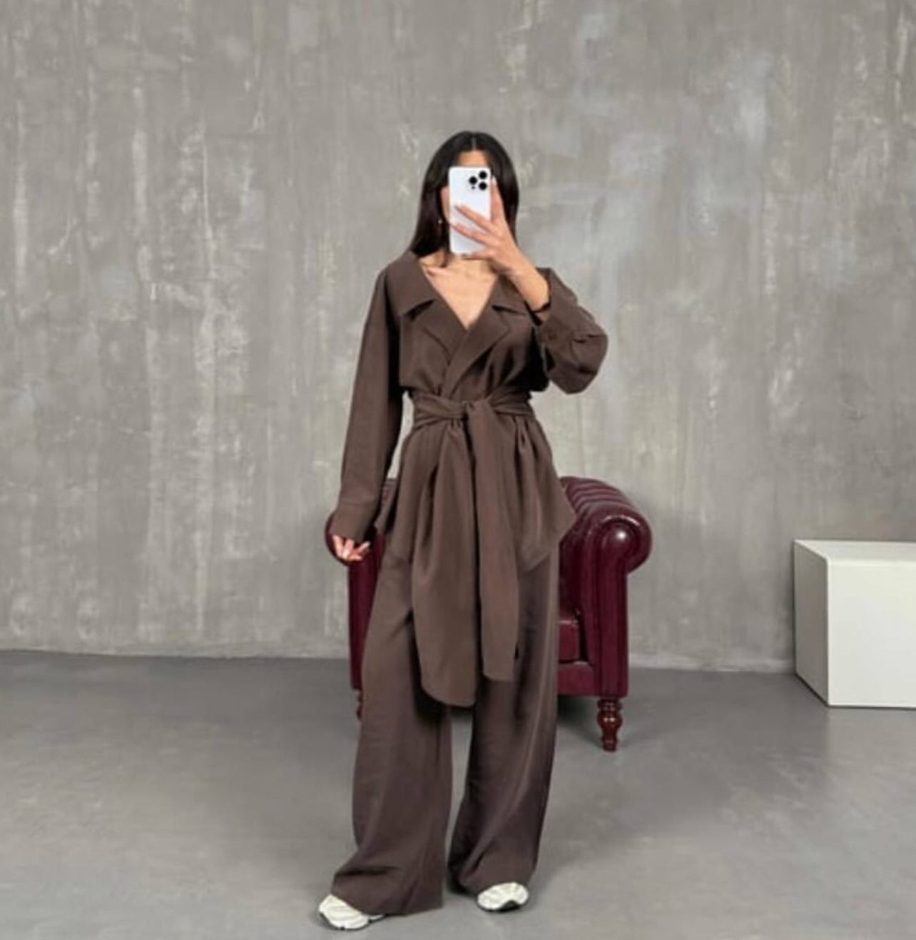 • Top: A flowy, belted cardigan with an elegant wrap-style design, giving a flattering silhouette.