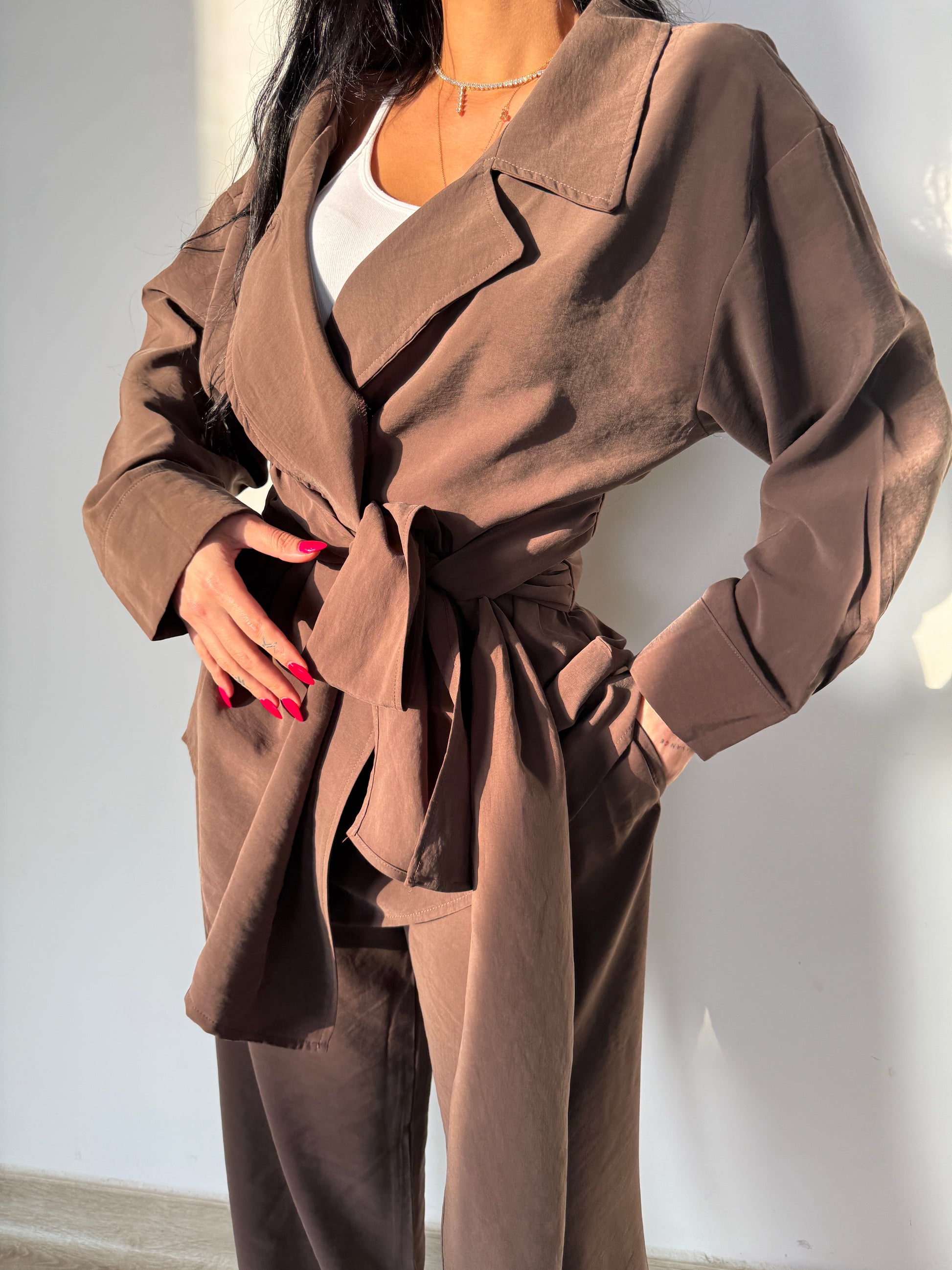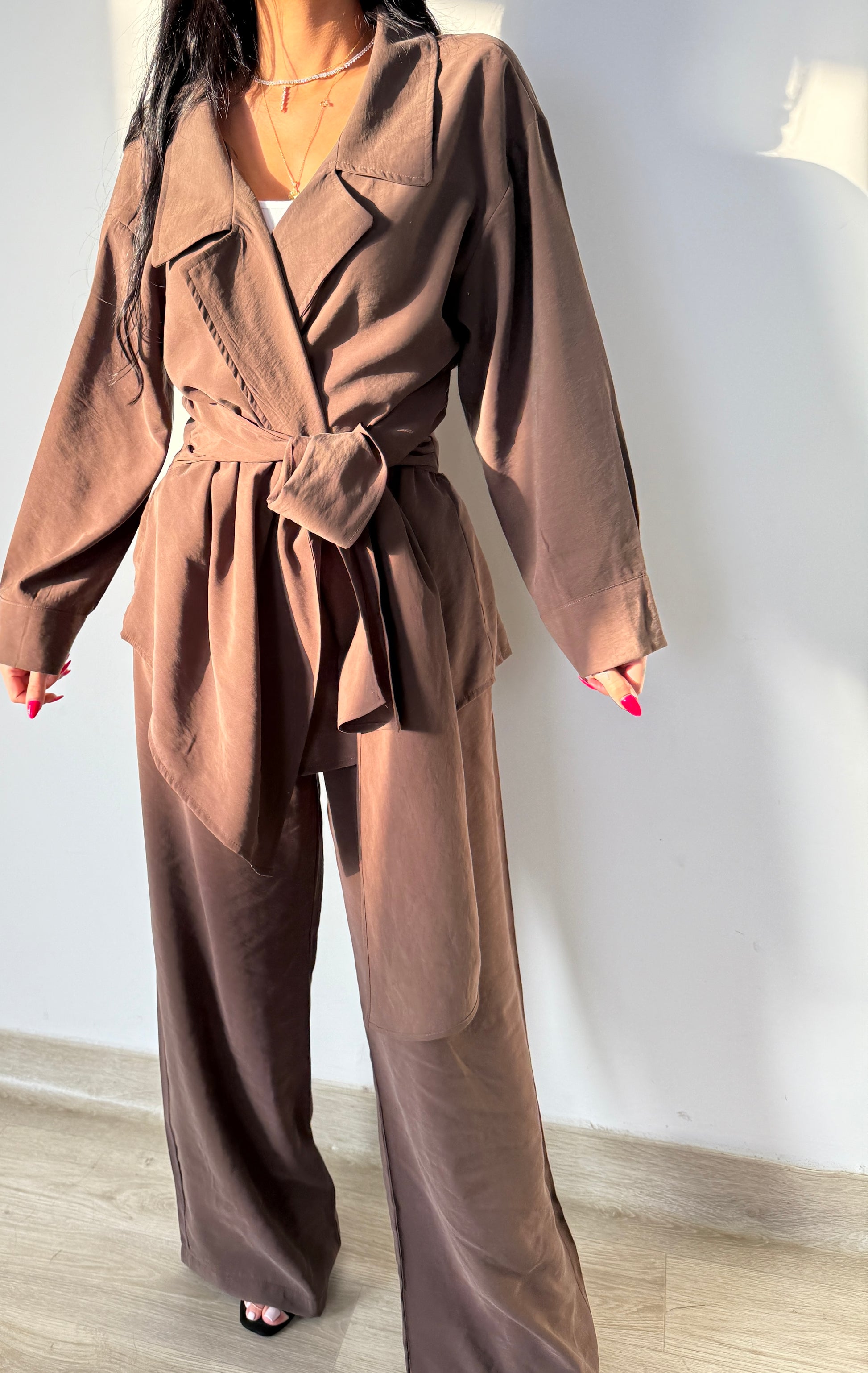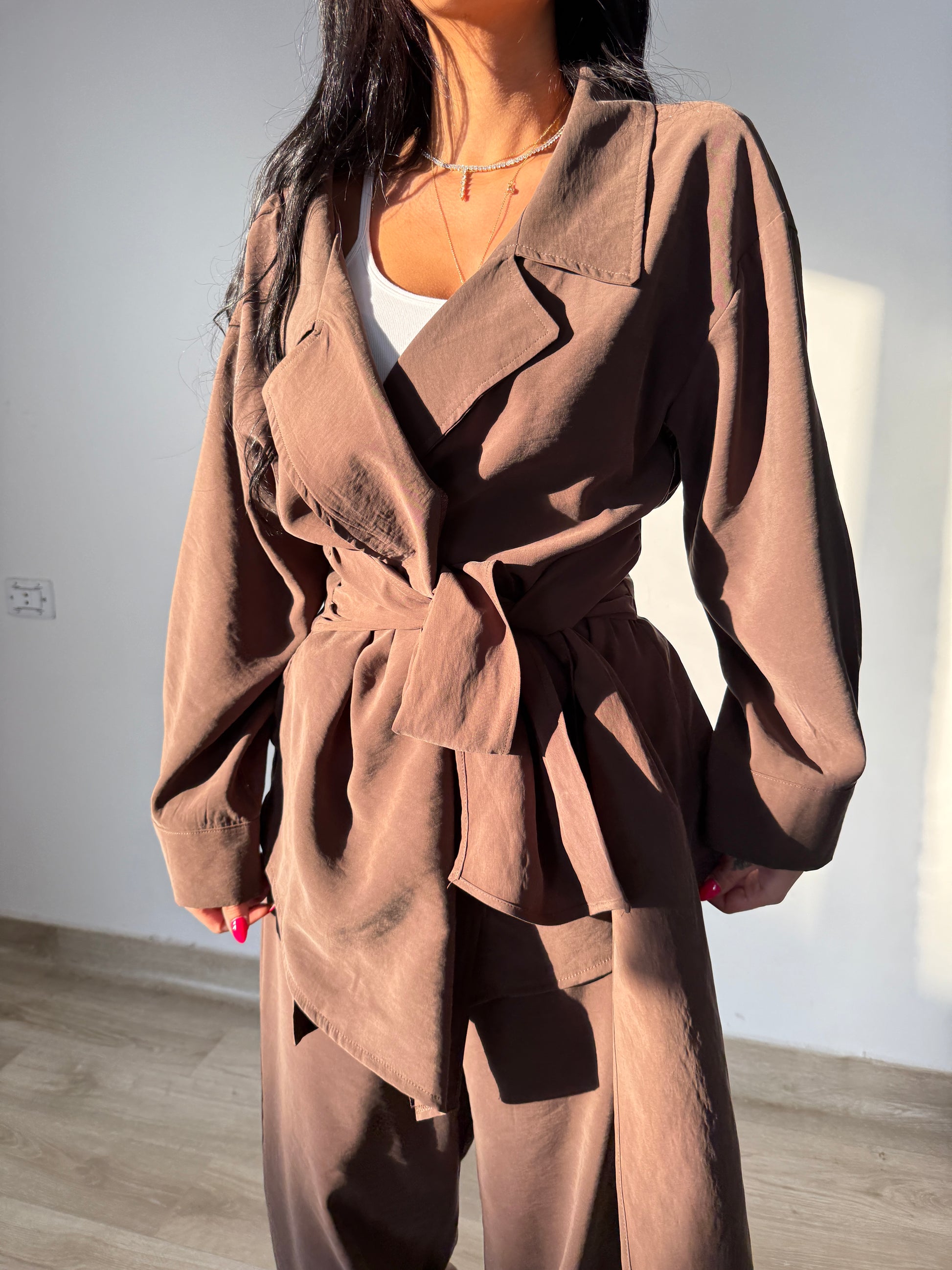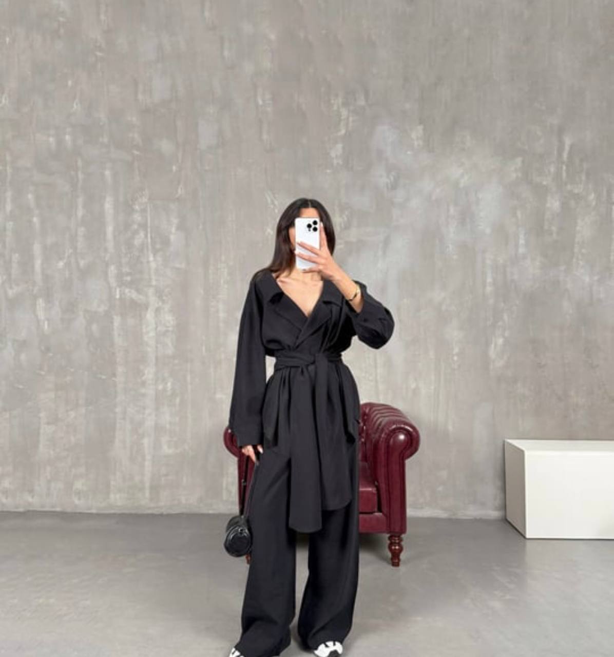• Top: A flowy, belted cardigan with an elegant wrap-style design, giving a flattering silhouette.