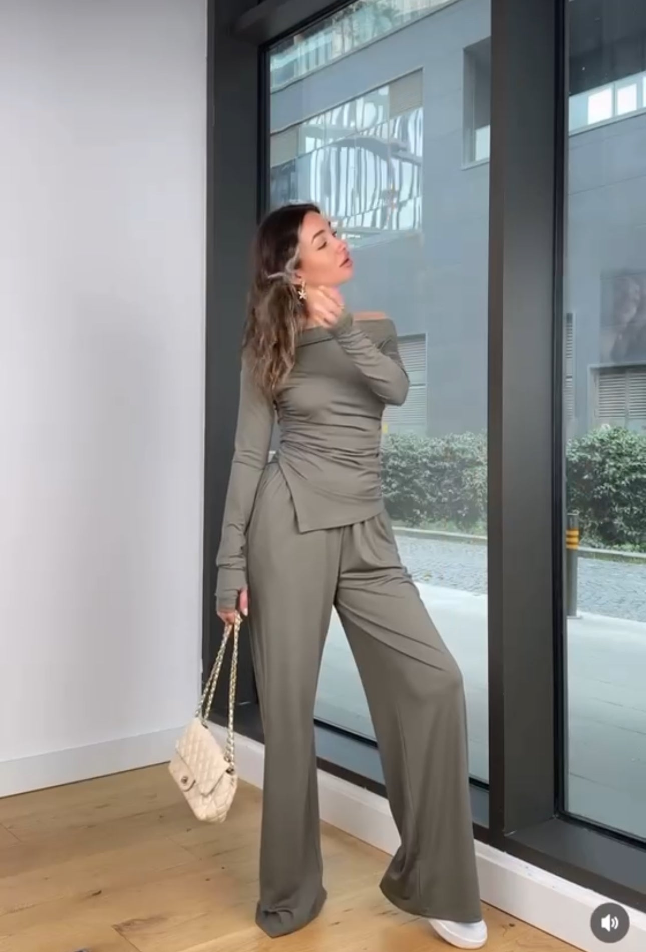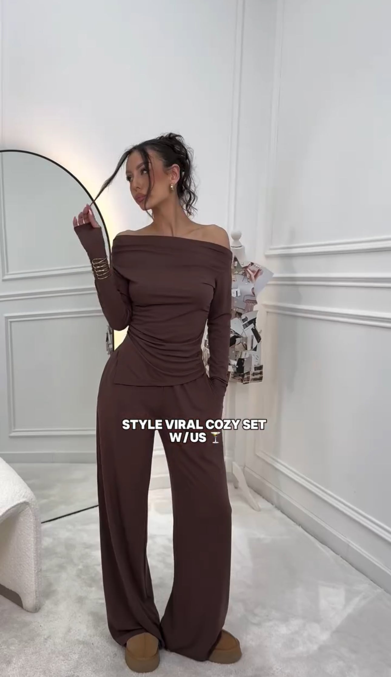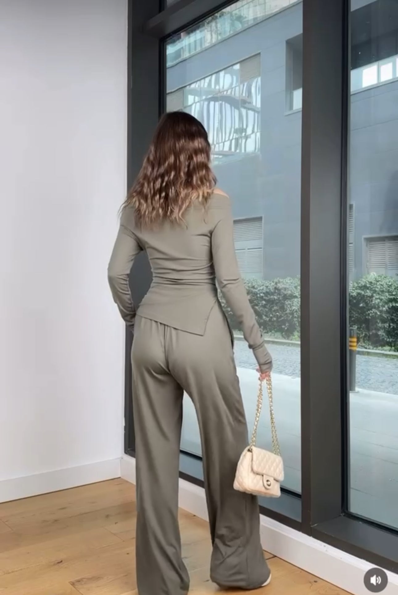 Elevate your casual style with our Luxe Comfort Off-Shoulder Lycra Set, designed for effortless elegance and all-day comfort. This two-piece ensemble features a chic off-the-shoulder long-sleeve top with a stylish asymmetric cut, perfectly paired with flowy wide-leg trousers. The soft, stretchy Lycra fabric offers a flattering fit while ensuring unrestricted movement. With an elastic waistband for extra ease