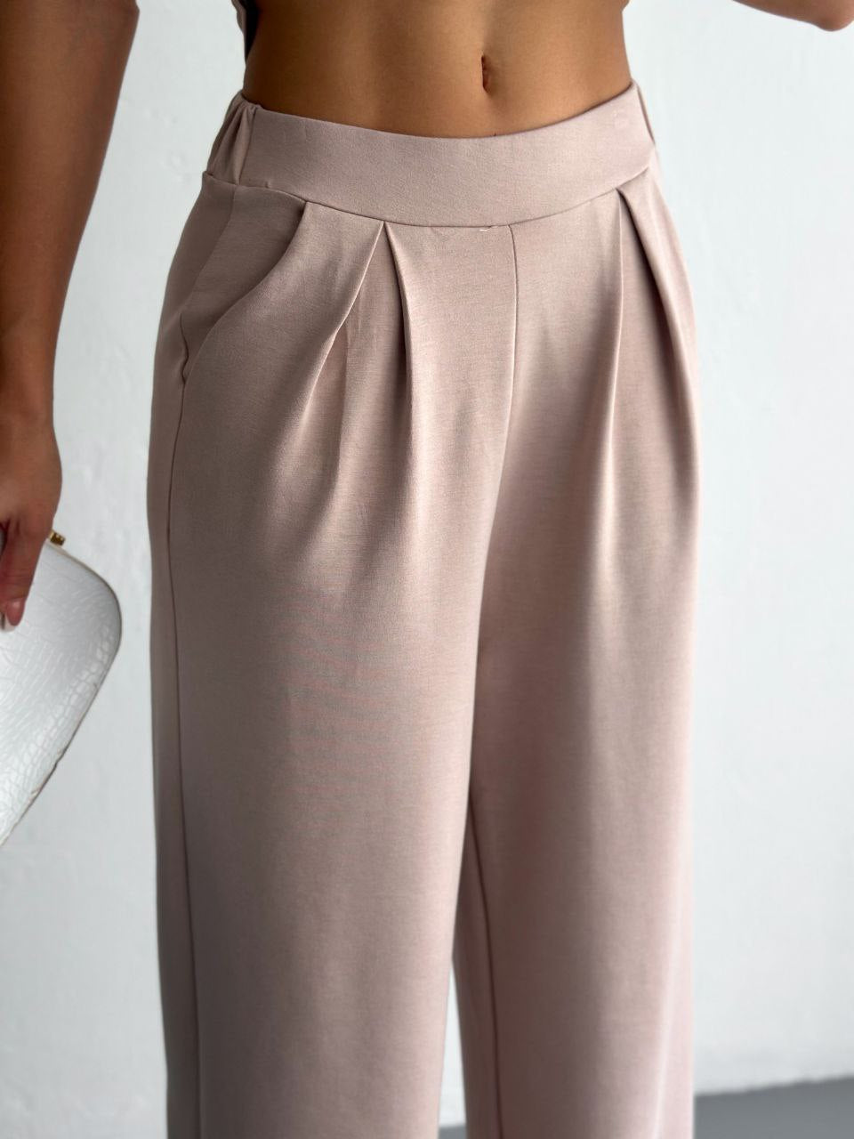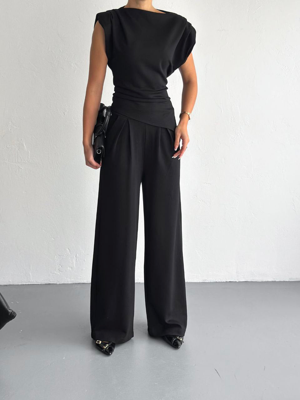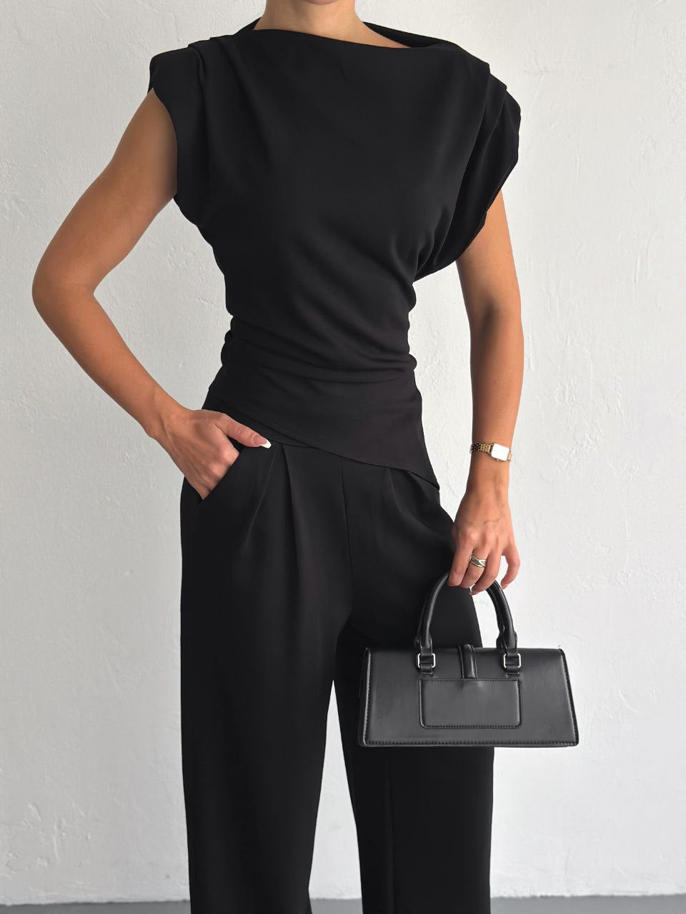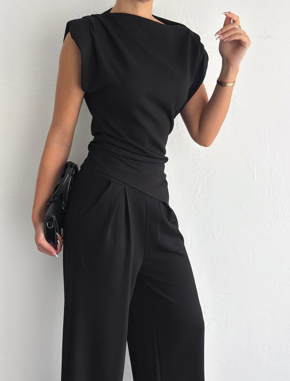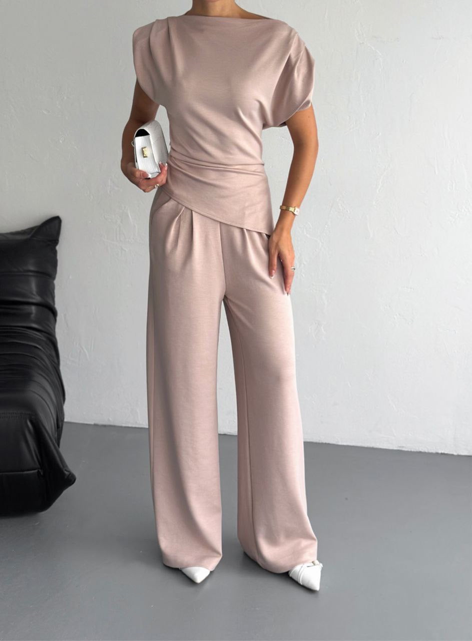 Elevate your everyday style with this two-piece padded-shoulder set, made from soft and stretchy lycra cotton. The top features structured padded shoulders for a bold silhouette and a flattering wrap-style waist. The matching wide-leg pants include side pockets for added comfort and function. Available in classic black and elegant beige—perfect for a smart casual or dressed-up look with zero effort.