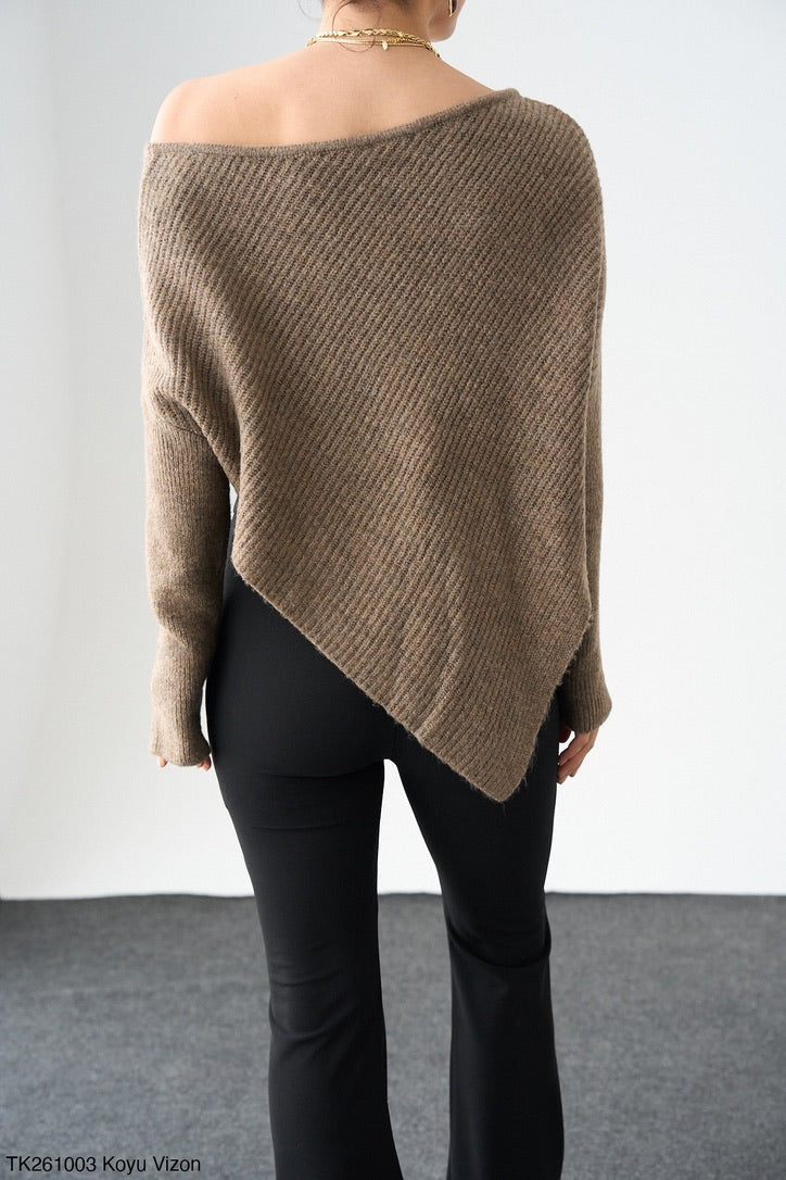 This off-shoulder knit sweater features a soft ribbed texture and a dramatic asymmetric pointed hem that creates a slimming, elongating silhouette. The wide neckline can be styled slightly off the shoulder for a feminine, modern look.