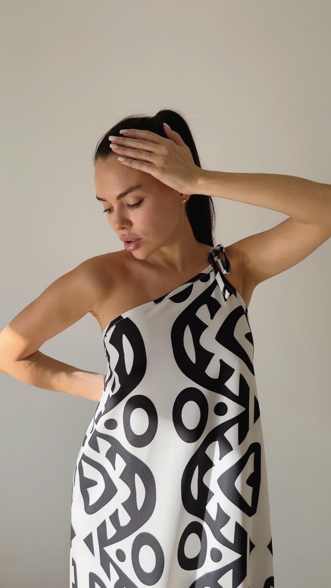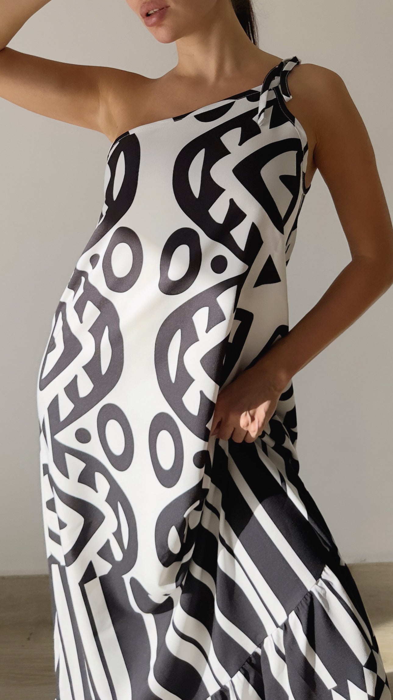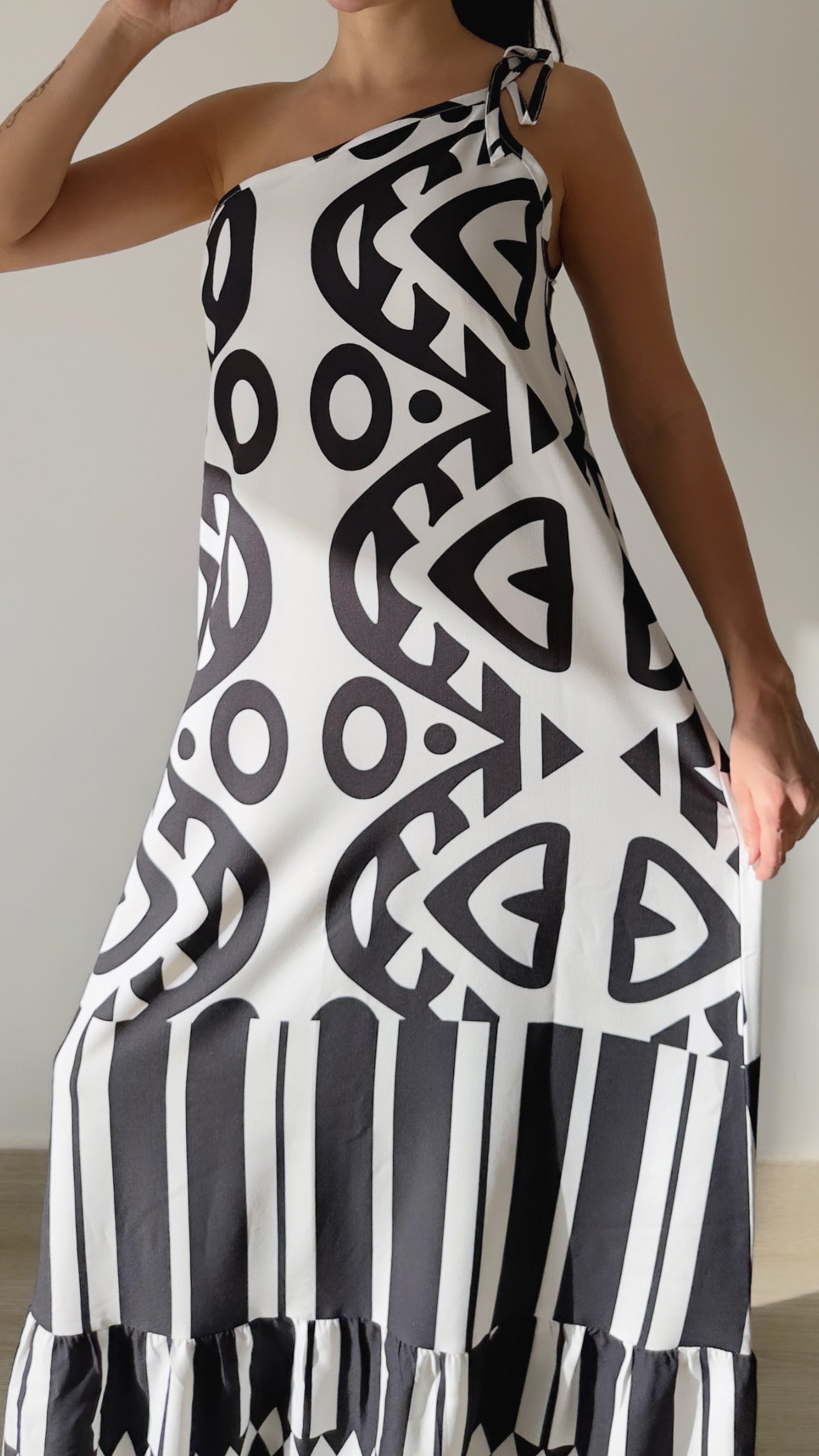 فستان ماكسي بكتف واحد بتصميم جريء ومميز بنقشات هندسية وعصرية. قماشته خفيفة ومريحة (رايون + بوليستر)، ما بشف وبيسحب على الجسم بأناقة.