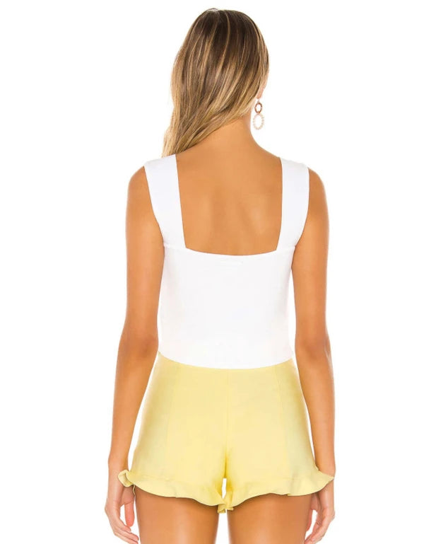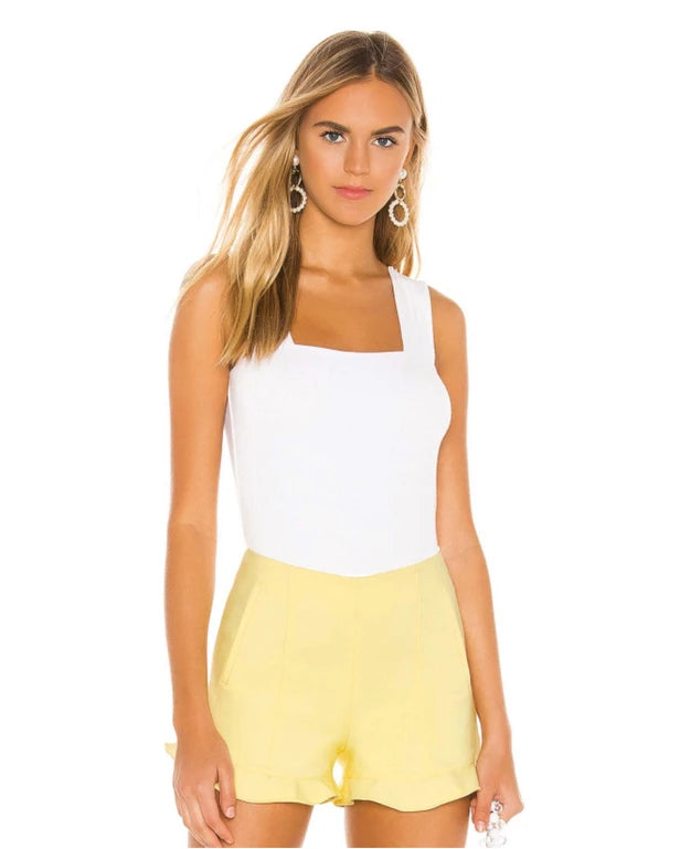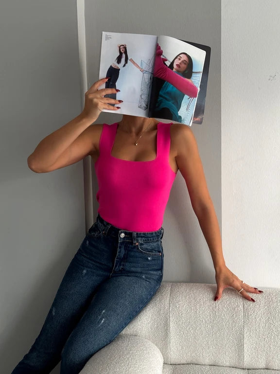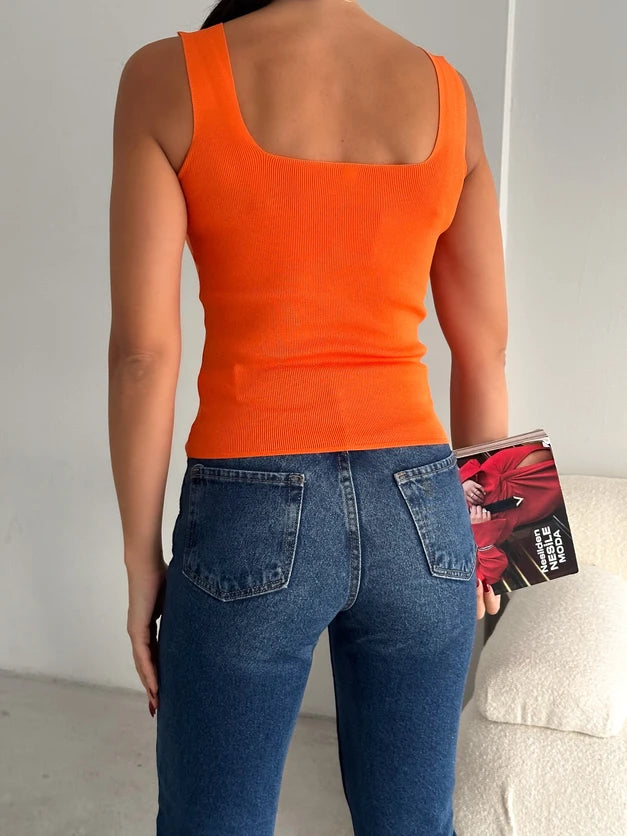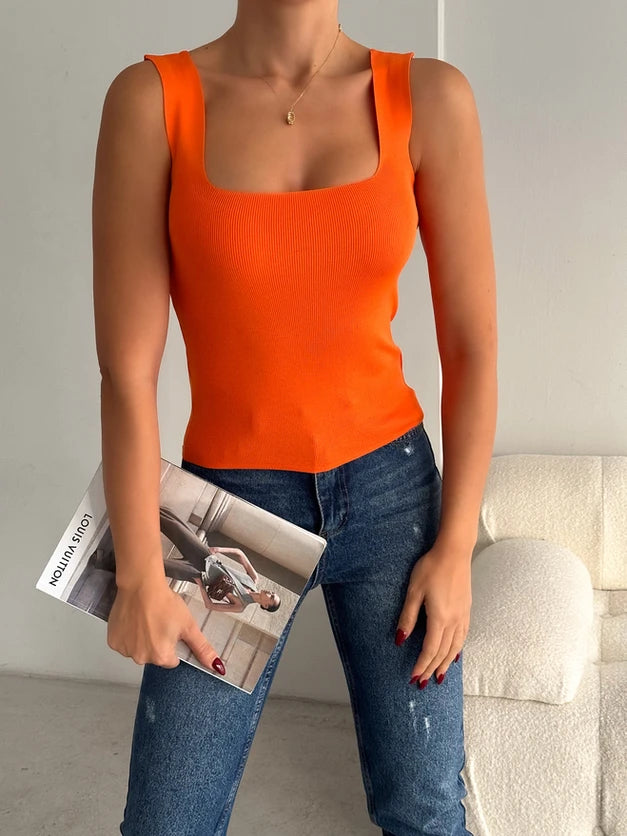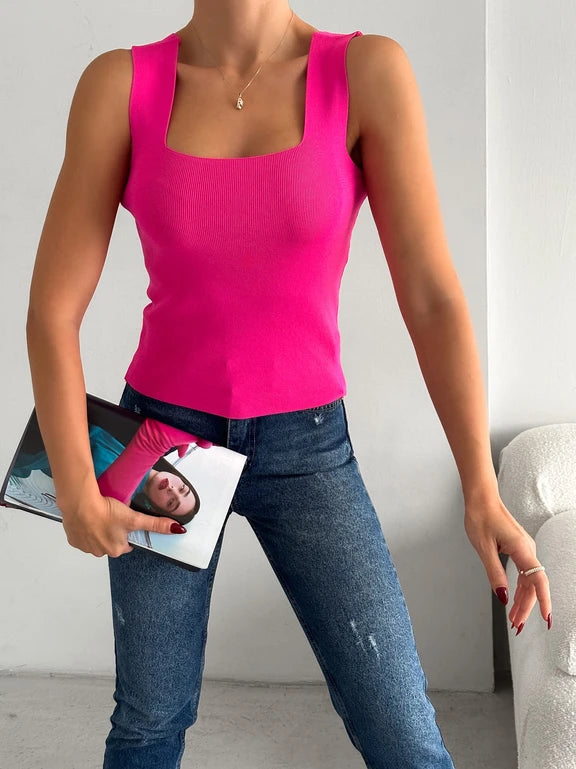 This ribbed-knit top is designed for a figure-hugging fit with wide shoulder straps and a flattering square neck.