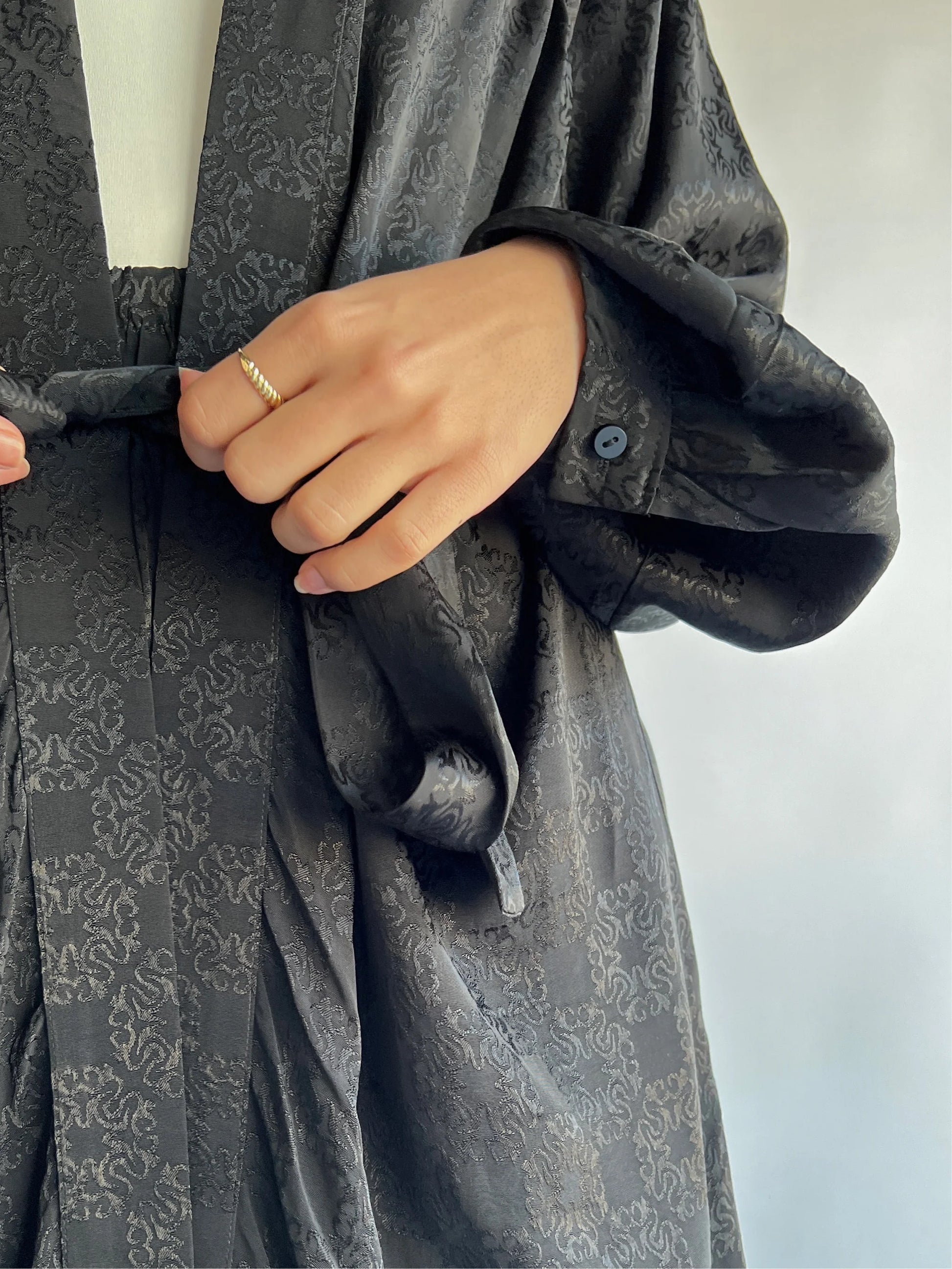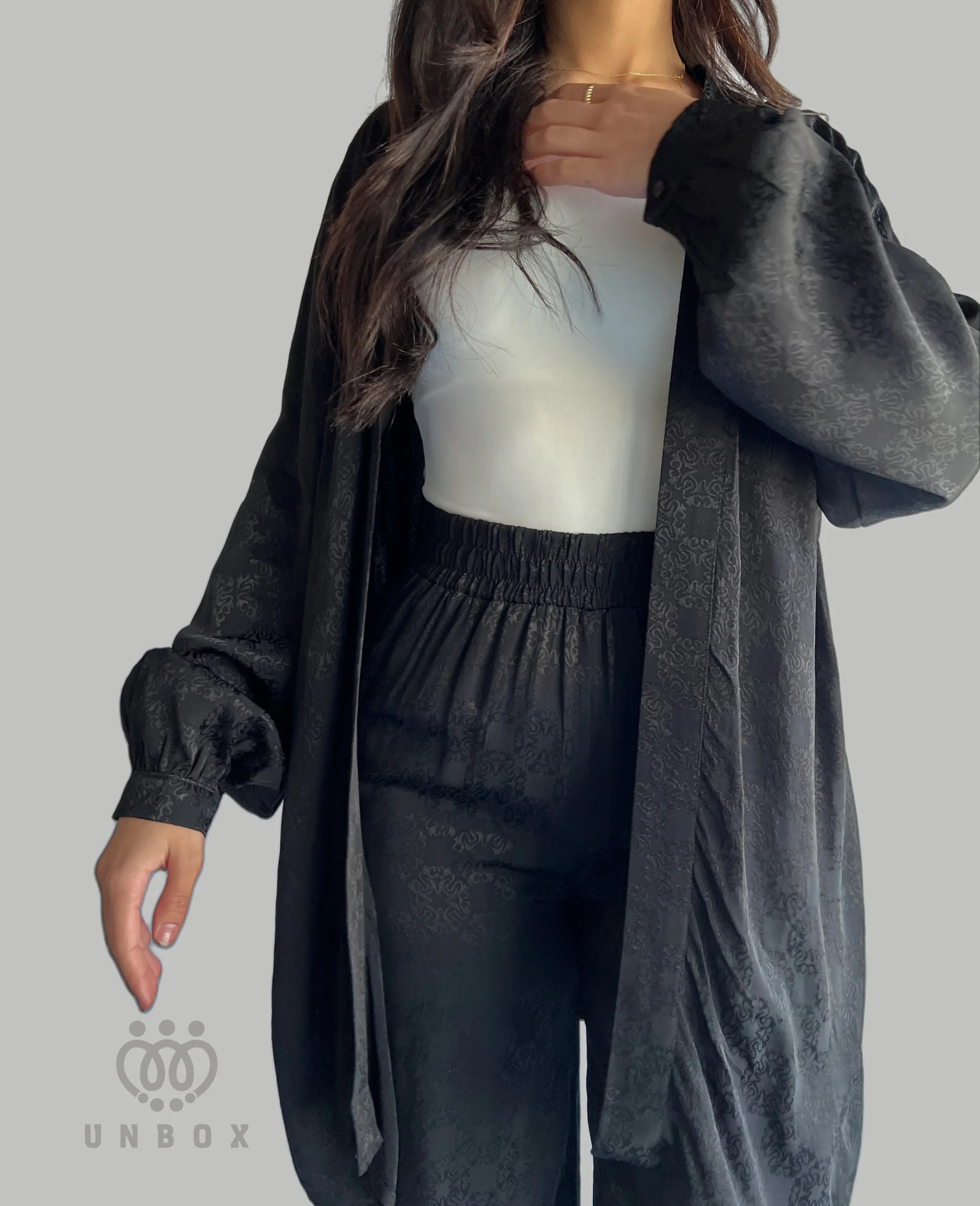 An elegant satin ensemble exuding allure with its wide-leg design, adorned with a waist belt and comfortable side pockets
