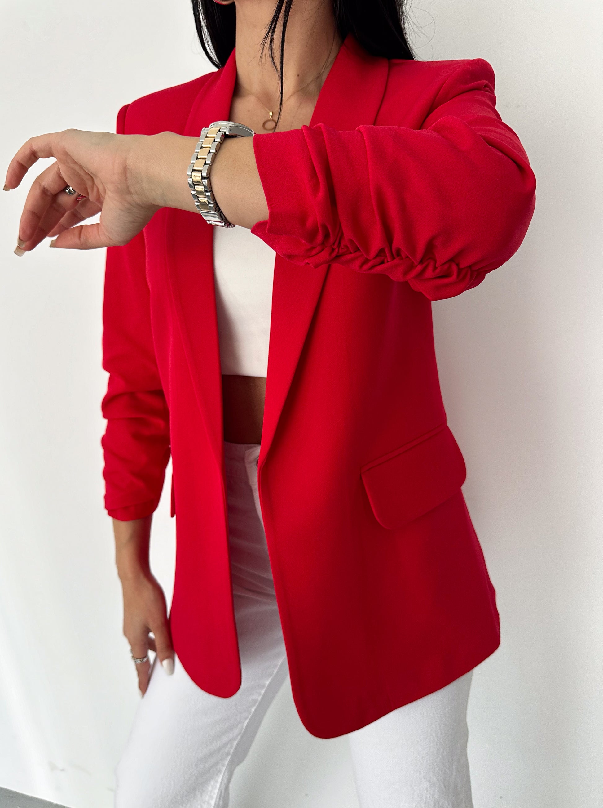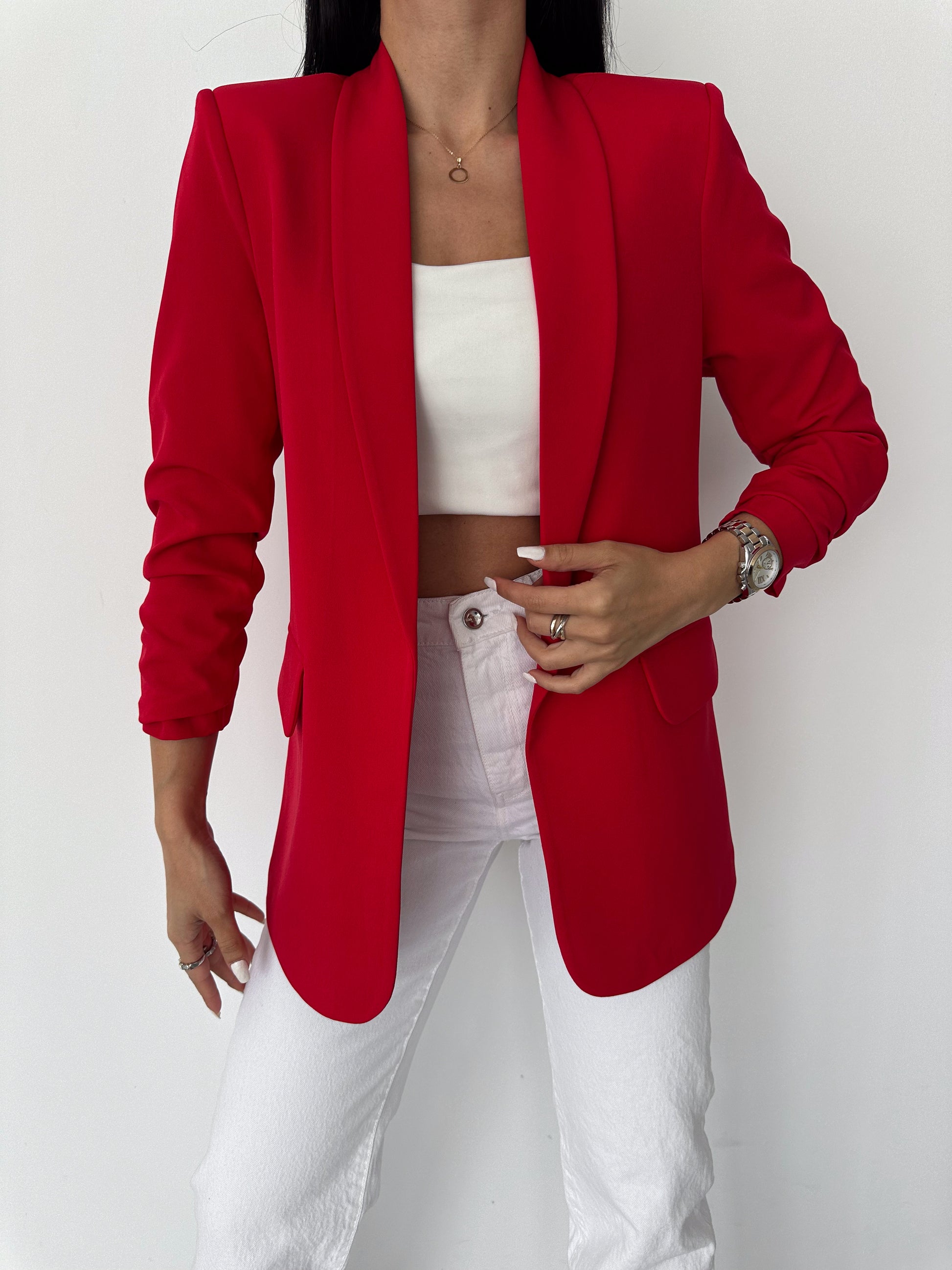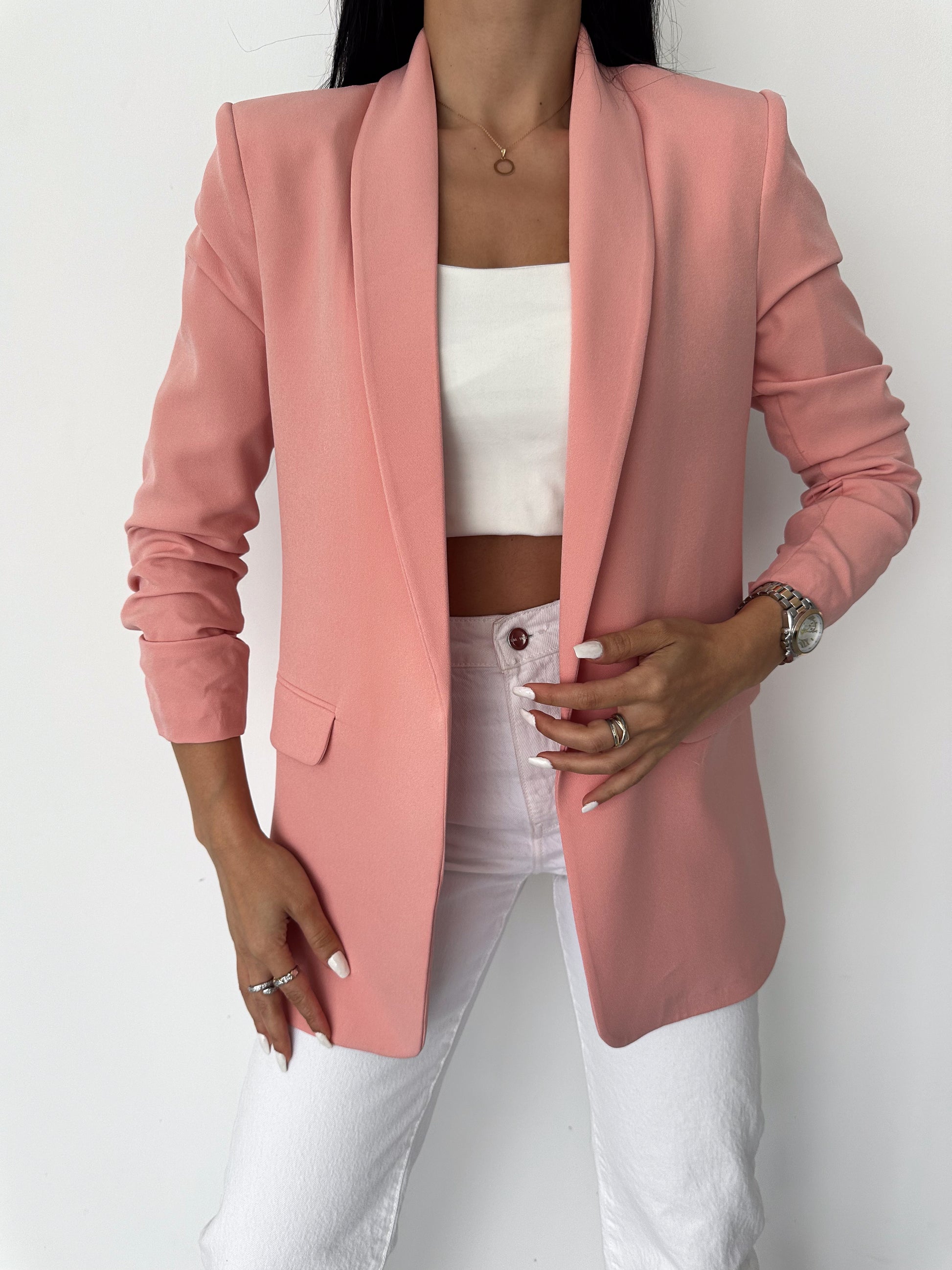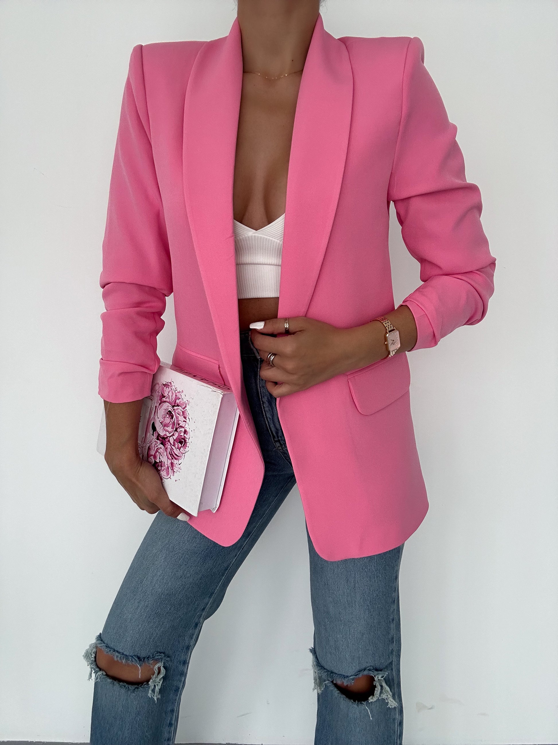 The chic Rolled-Up Sleeve Blazer. Designed for both style and comfort, this long blazer features a tailored fit that accentuates your silhouette. With its versatile design, it comes in six stunning colors, allowing you to mix and match effortlessly for any occasion.