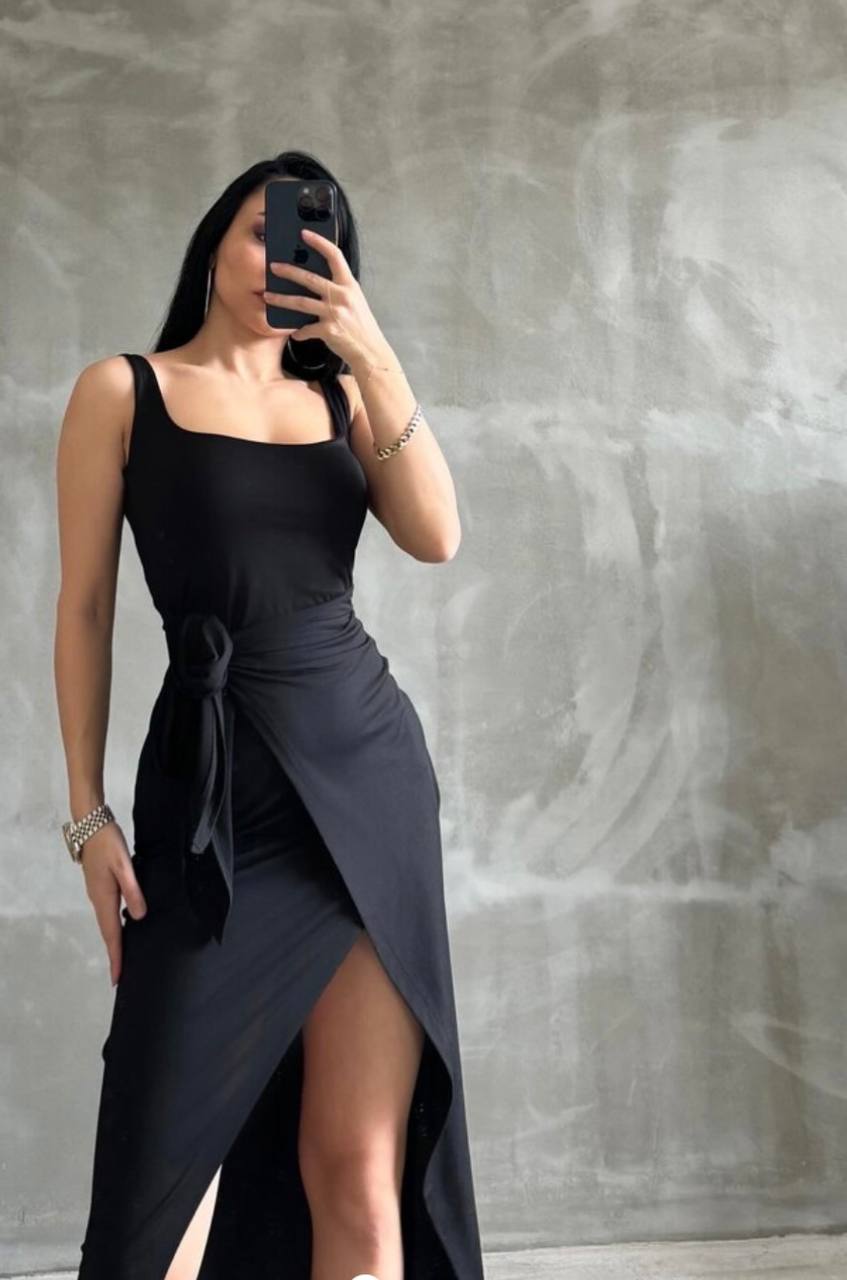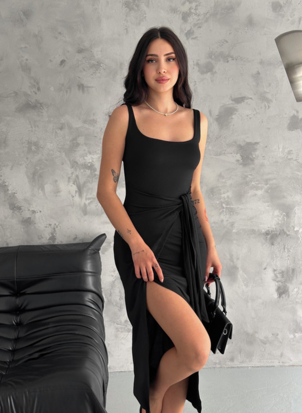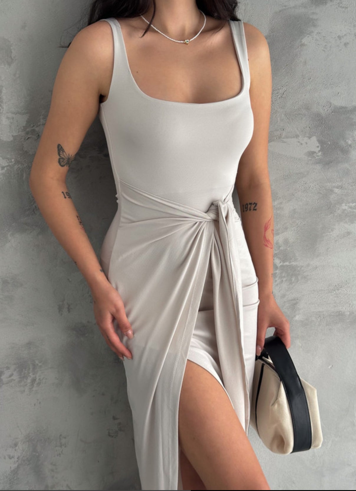 Upgrade your look with our Sleek Twist Midi Dress. Featuring a side slit for added flair, it's the perfect blend of style and elegance for any occasion.