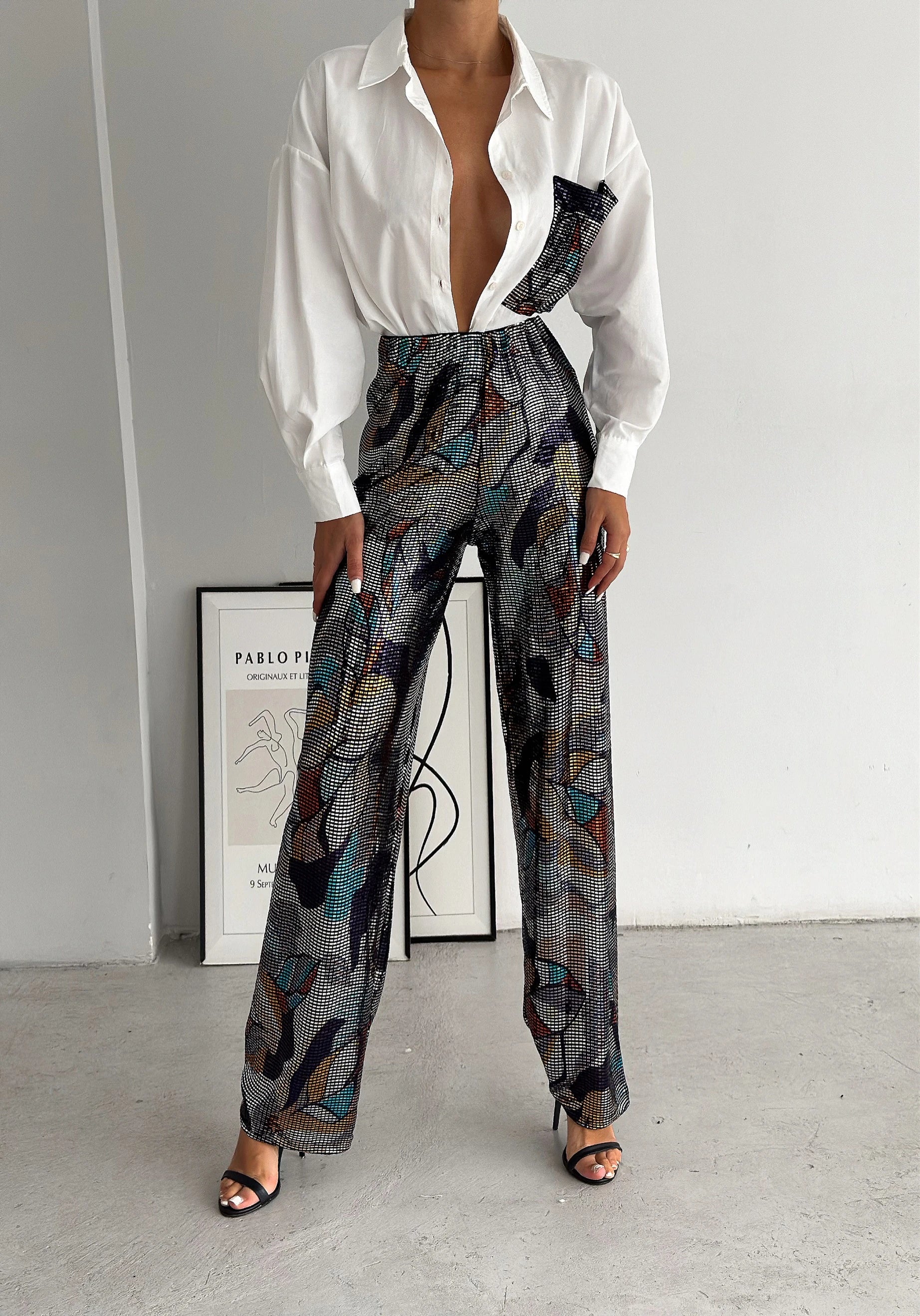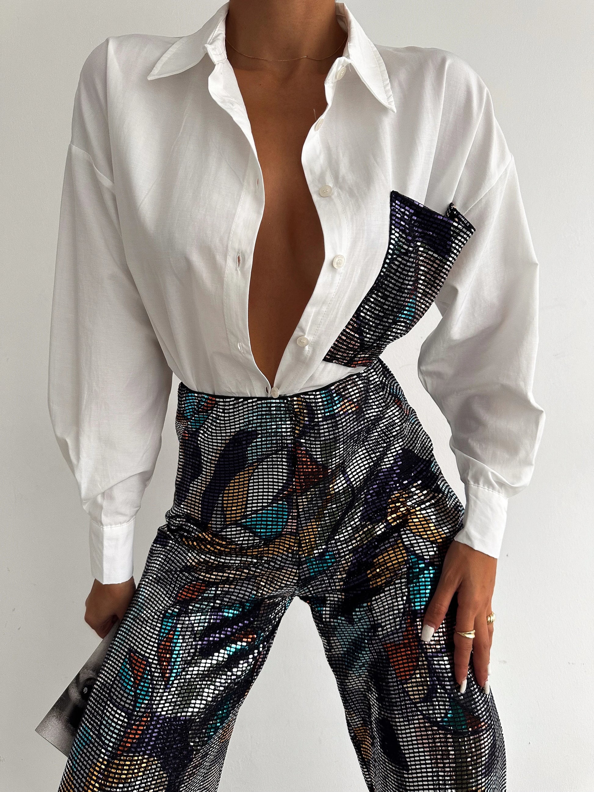 STRAIGHT FIT TROUSERS WITH SEQUINS AND OVERSIZED SHIRT